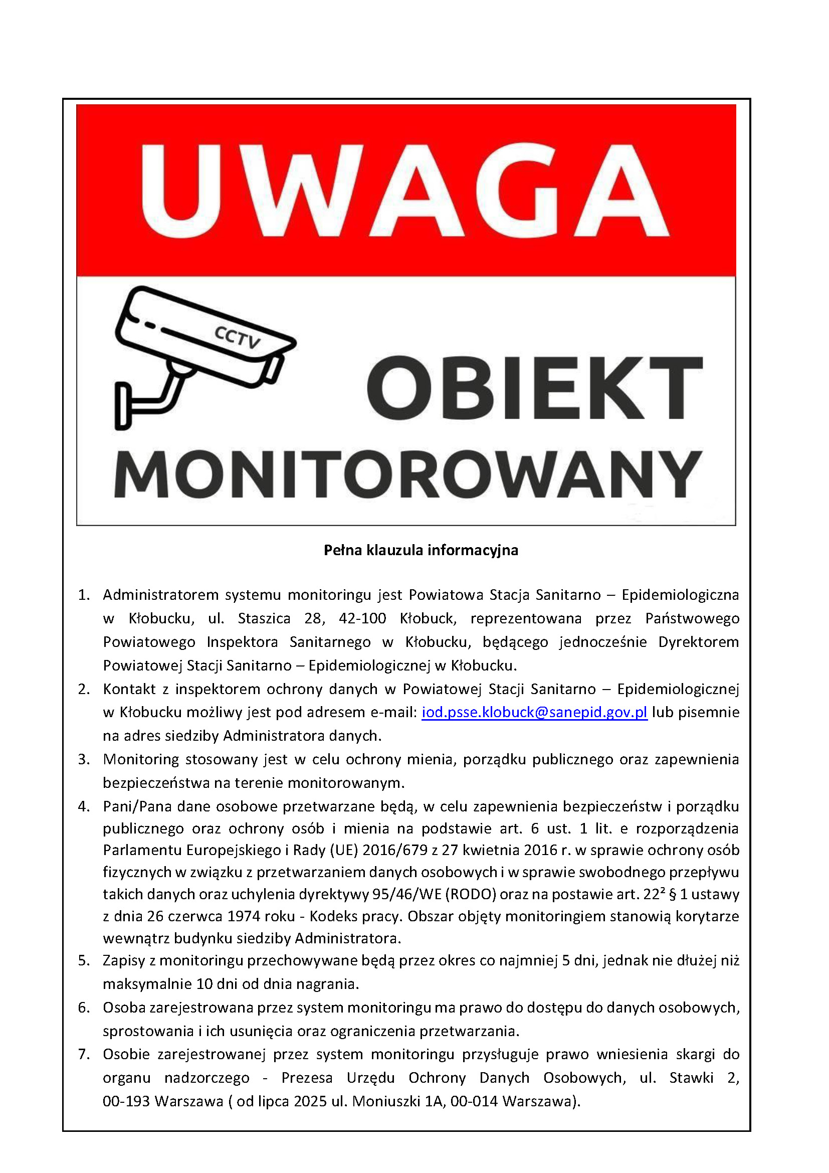 - Administratorem systemu monitoringu jest Powiatowa Stacja Sanitarno – Epidemiologiczna w Kłobucku, ul. Staszica 28, 42-100 Kłobuck, reprezentowana przez Państwowego Powiatowego Inspektora Sanitarnego w Kłobucku, będącego jednocześnie Dyrektorem Powiatowej Stacji Sanitarno – Epidemiologicznej w Kłobucku.