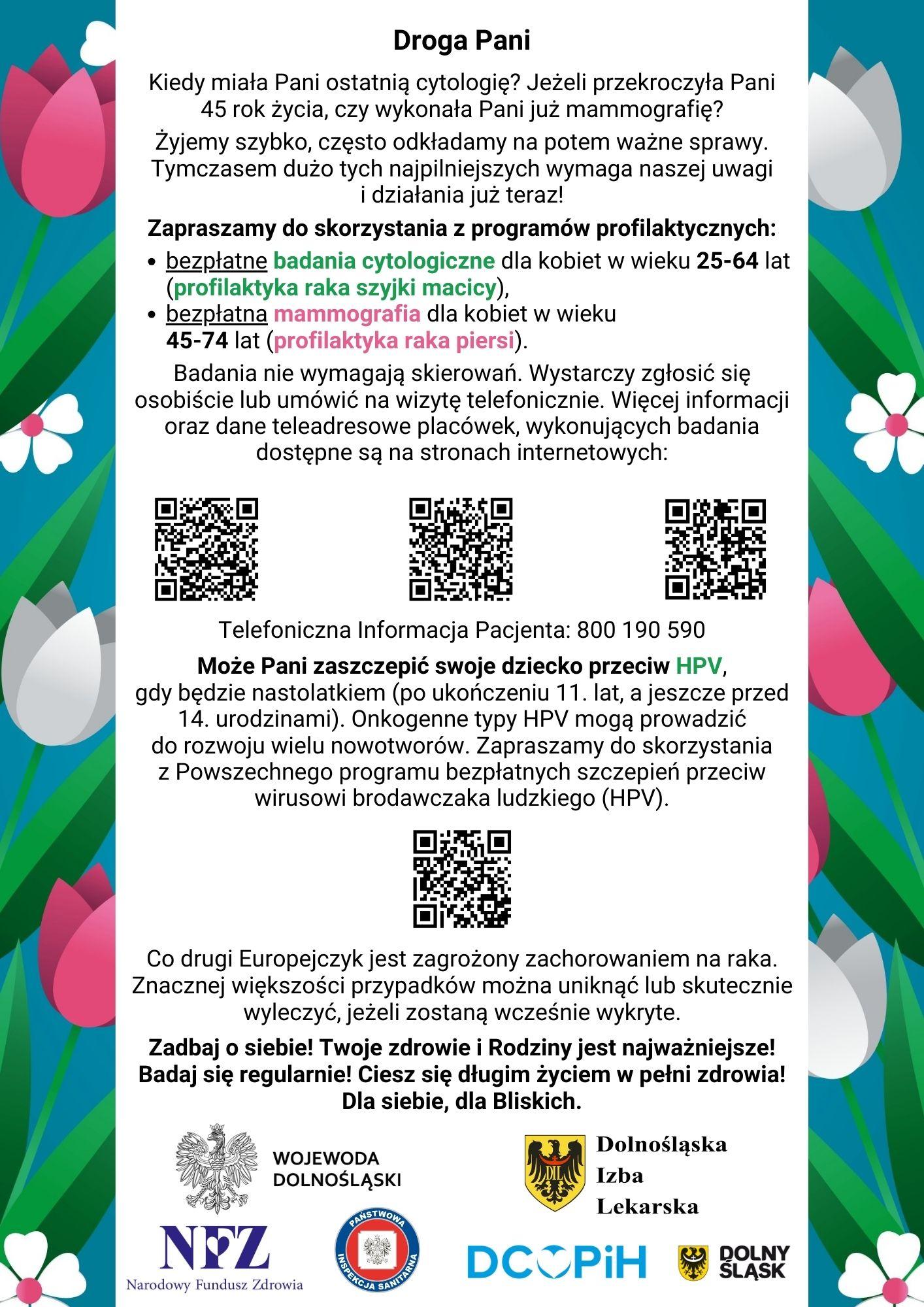 - List dla pani - zaproszenie do udziału w badaniach profilaktycznych (cytologia, mammografia) oraz informacja o miejscach wykonywania świadczeń w programach profilaktycznych dedykowanych kobietom, finansowanych ze środków publicznych (NFZ)