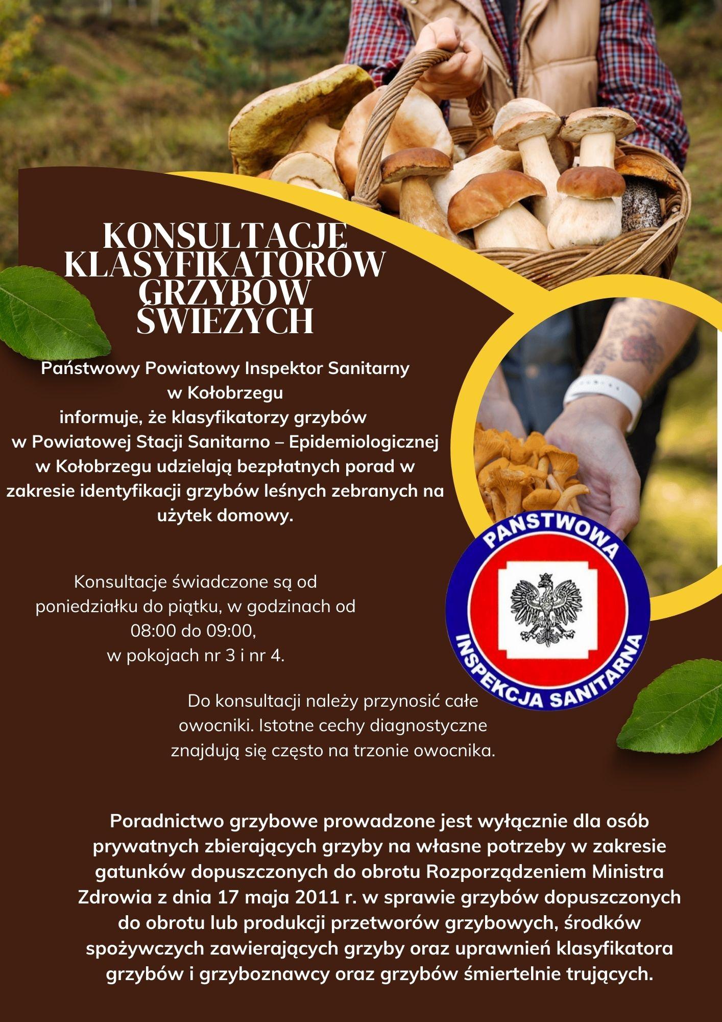 Państwowy Powiatowy Inspektor Sanitarny w Kołobrzegu informuje, że klasyfikatorzy grzybów w Powiatowej Stacji Sanitarno – Epidemiologicznej w Kołobrzegu udzielają bezpłatnych porad w zakresie identyfikacji grzybów leśnych zebranych na użytek domowy. |