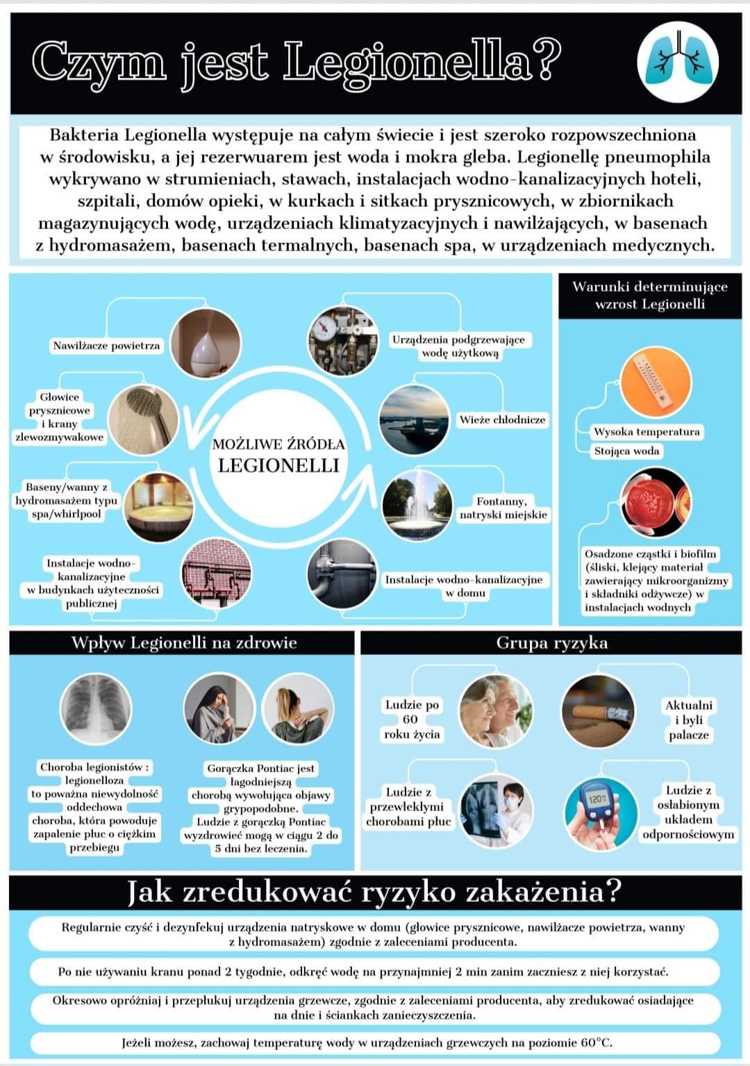 Przyczyną wysokiego skażenia wody pałeczkami Legionella może być niewłaściwa eksploatacja instalacji wody cieplej, jak również zbyt niskie stężenie związków dezynfekcyjnych, a także pH wody. Niewątpliwie bardzo ważnym czynnikiem wpływającym na namnażanie się bakterii w instalacjach wody cieplej jest wiek instalacji, warunki jej eksploatacji tzn. prędkość przepływu wody, temperatura, czas transportu, rodzaj zastosowanych materiałów (przewody, uszczelki, złączki, membrany) oraz jej stan techniczny.