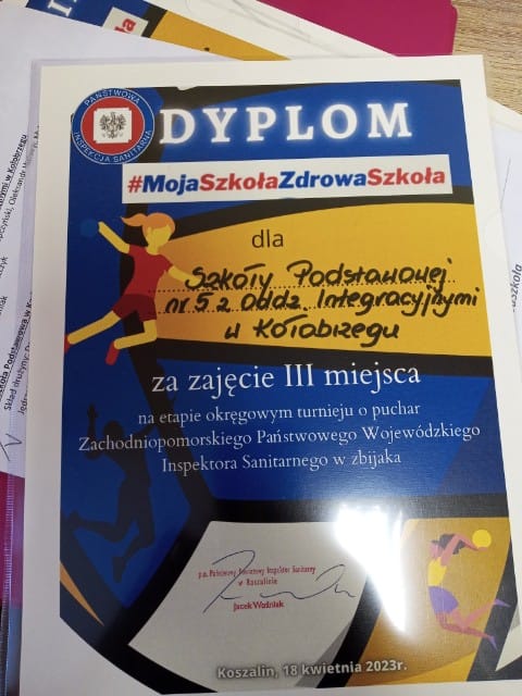 informuje, że uczniowie Szkoły Podstawowej nr 5 z Oddziałami Integracyjnymi w Kołobrzegu dnia 18.04.2023 zajęli 3 miejsce w Turnieju o Puchar Zachodniopomorskiego Państwowego Wojewódzkiego Inspektora Sanitarnego w ,,Zbijaka” na szczeblu okręgowym, organizowanym w ramach podsumowania kampanii wojewódzkiej #MojaSzkołaZdrowaSzkoła.