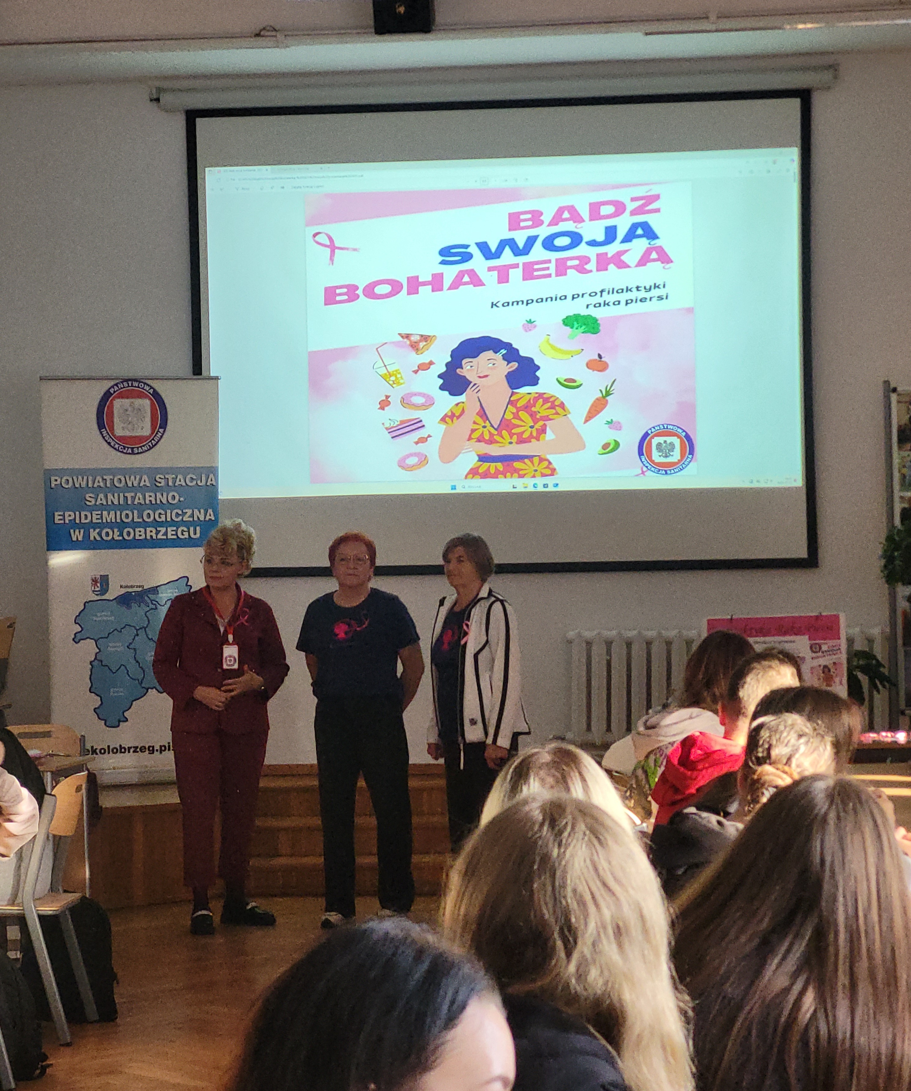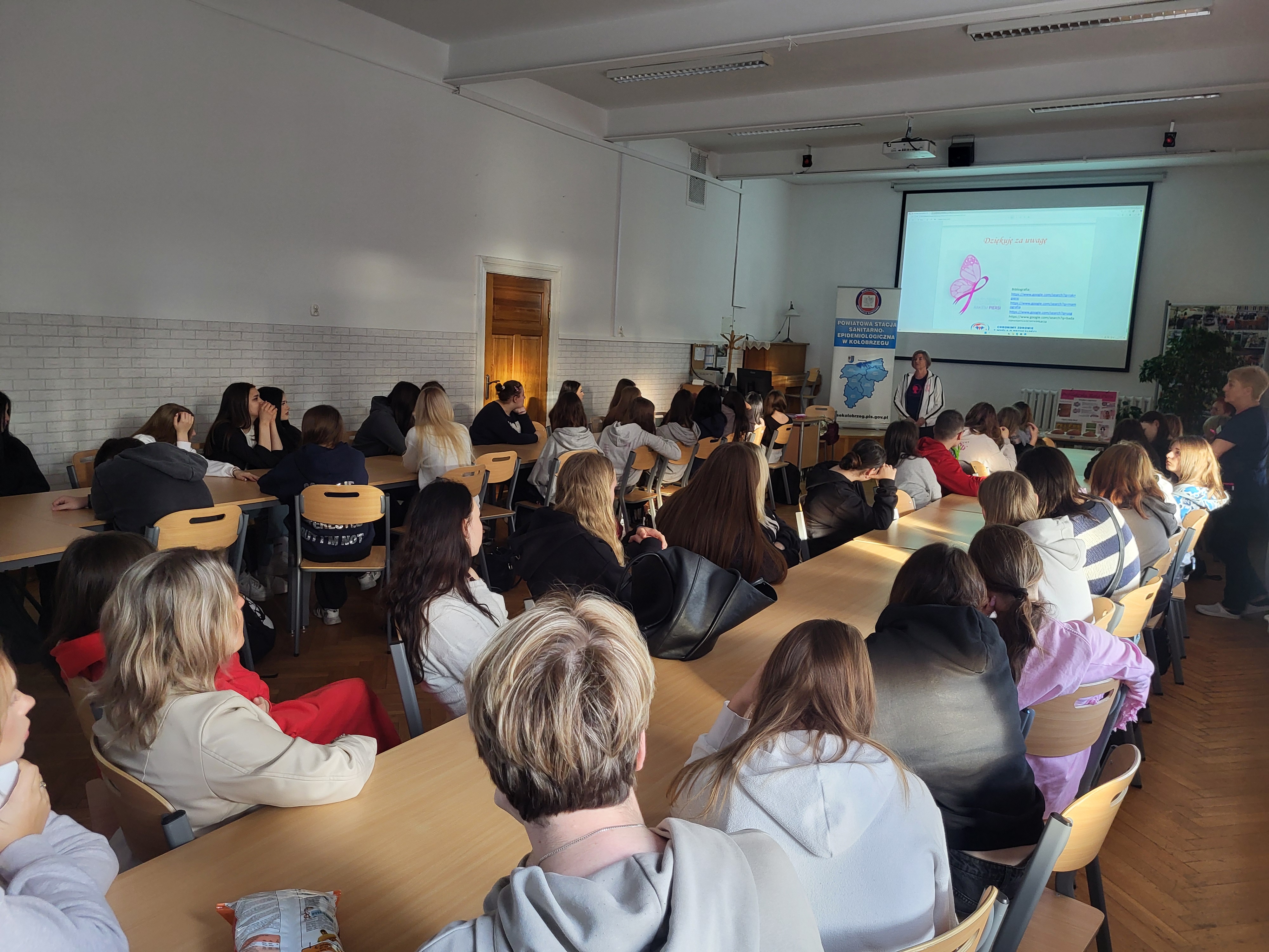 Dzisiaj w Zespole Szkół nr 2 im. Bolesława III Krzywoustego w Kołobrzegu w ramach obchodów Miesiąca Świadomości Raka Piersi, wspólnie z Kołobrzeskim Klubem Amazonek oraz Pielęgniarką Szkolną, PSSE w Kołobrzegu zorganizowała spotkanie z młodzieżą. Przeprowadzałyśmy edukację z zakresu profilaktyki nowotworów piersi oraz warsztaty z nauki samobadania na fantomie piersi z imitacjami zmian nowotworowych. Ponadto, Panie z Klubu Amazonek podzieliły się swoimi historiami zderzenia z rakiem piersi, udowadniając, że tę walkę można wygrać.