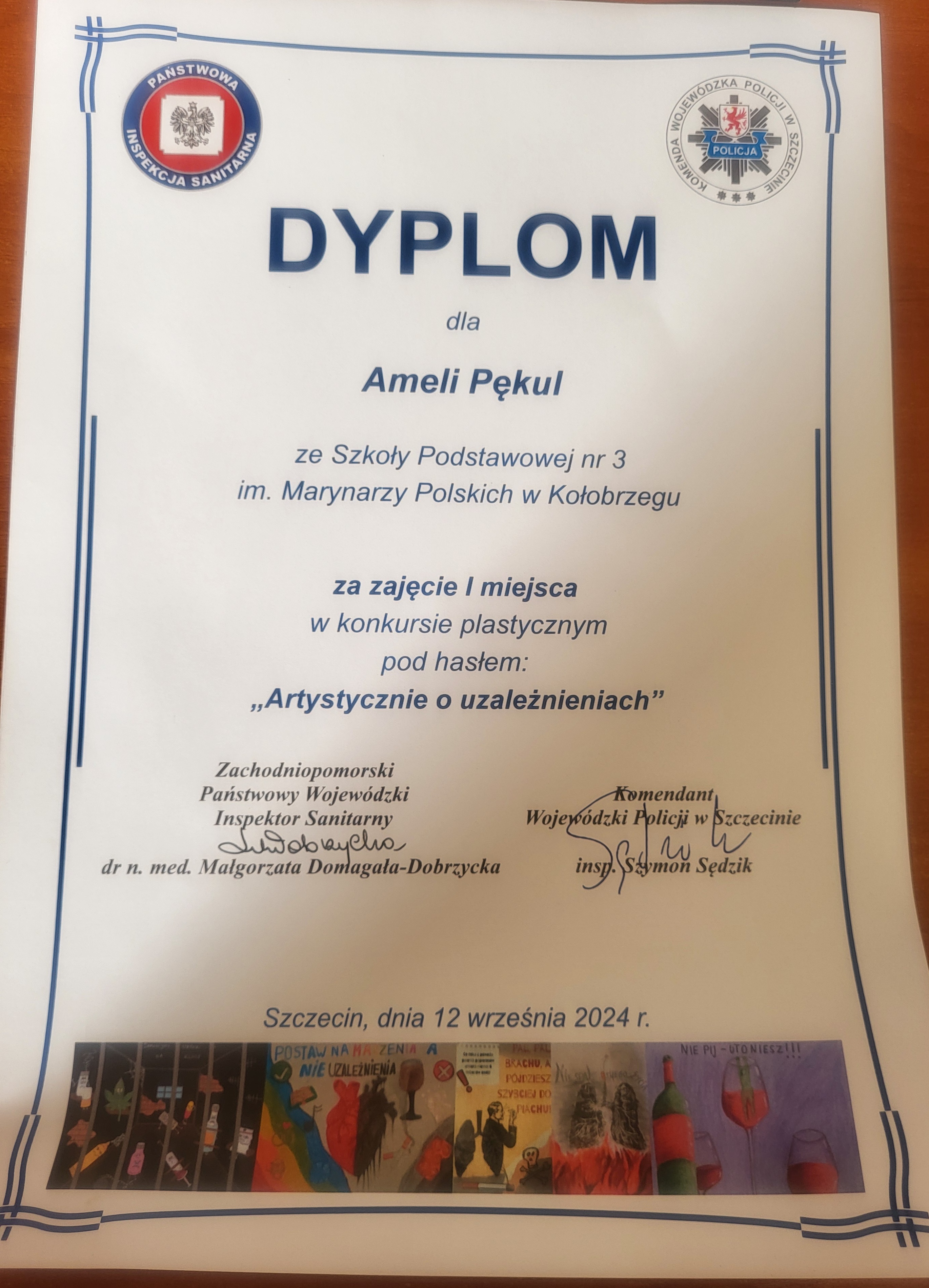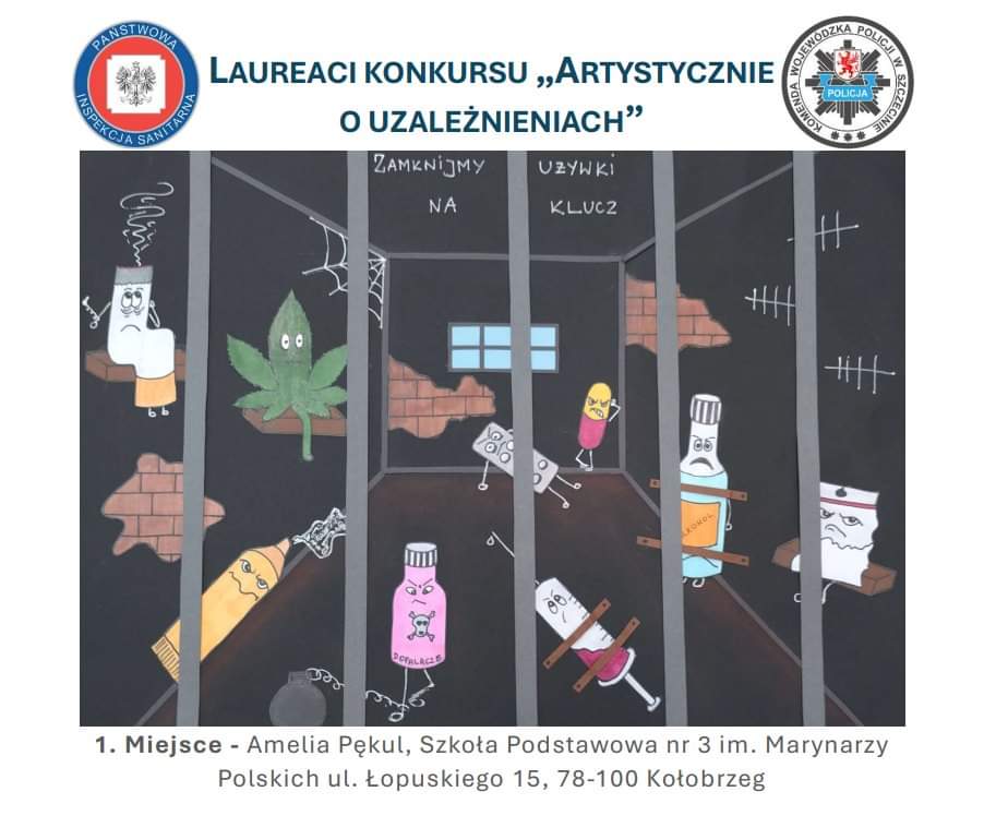Państwowy Powiatowy Inspektor Sanitarny w Kołobrzegu informuje, że uczennica Amelia Pękul ze Szkoły Podstawowej nr 3 im. Marynarzy Polskich w Kołobrzegu zajęła I miejsce w wojewódzkim konkursie plastycznym pt. Artystycznie o uzależnieniach. Konkurs został zorganizowany przez Zachodniopomorskiego Państwowego Wojewódzkiego Inspektora Sanitarnego w Szczecinie wraz z Komendantem Wojewódzkim Policji w Szczecinie w ramach programu Porozmawiajmy o Zdrowiu i Nowych Zagrożeniach, który skierowany był do młodzieży ze szkół podstawowych z terenu województwa zachodniopomorskiego i miał na celu wzmocnienie świadomości młodzieży w zakresie problematyki uzależnień. Zadaniem uczestników konkursu było wykonanie plakatu na powyższy temat.