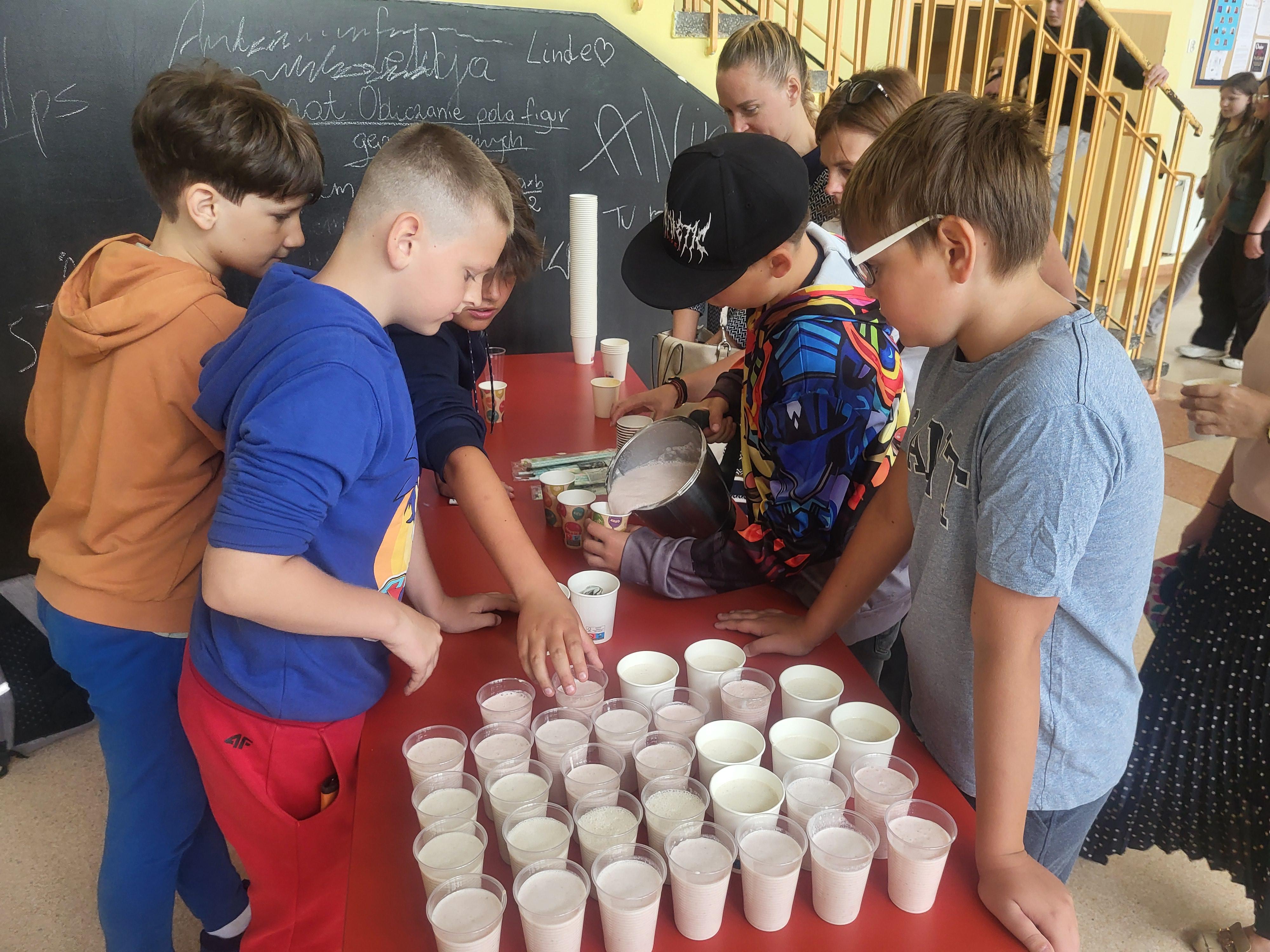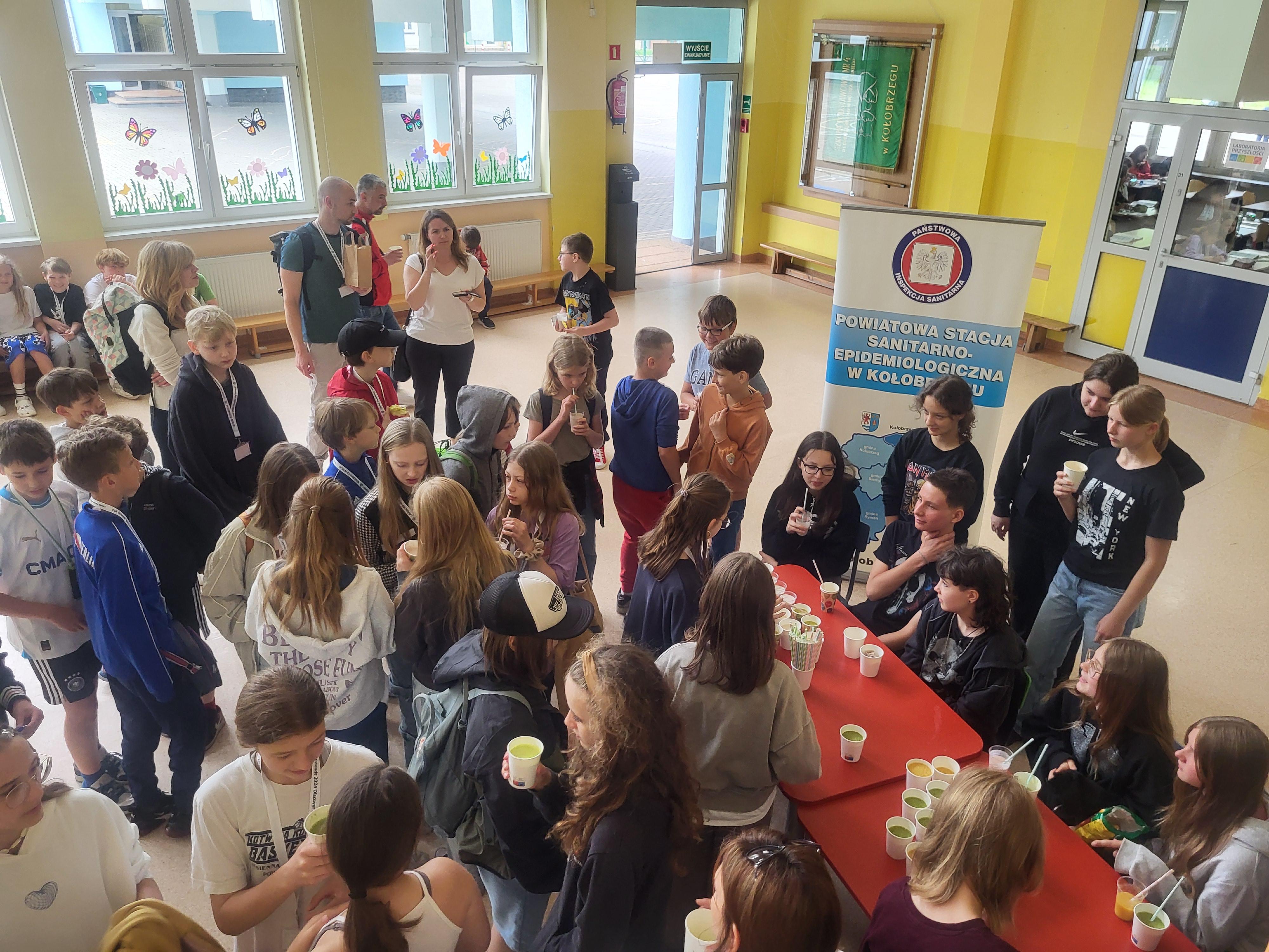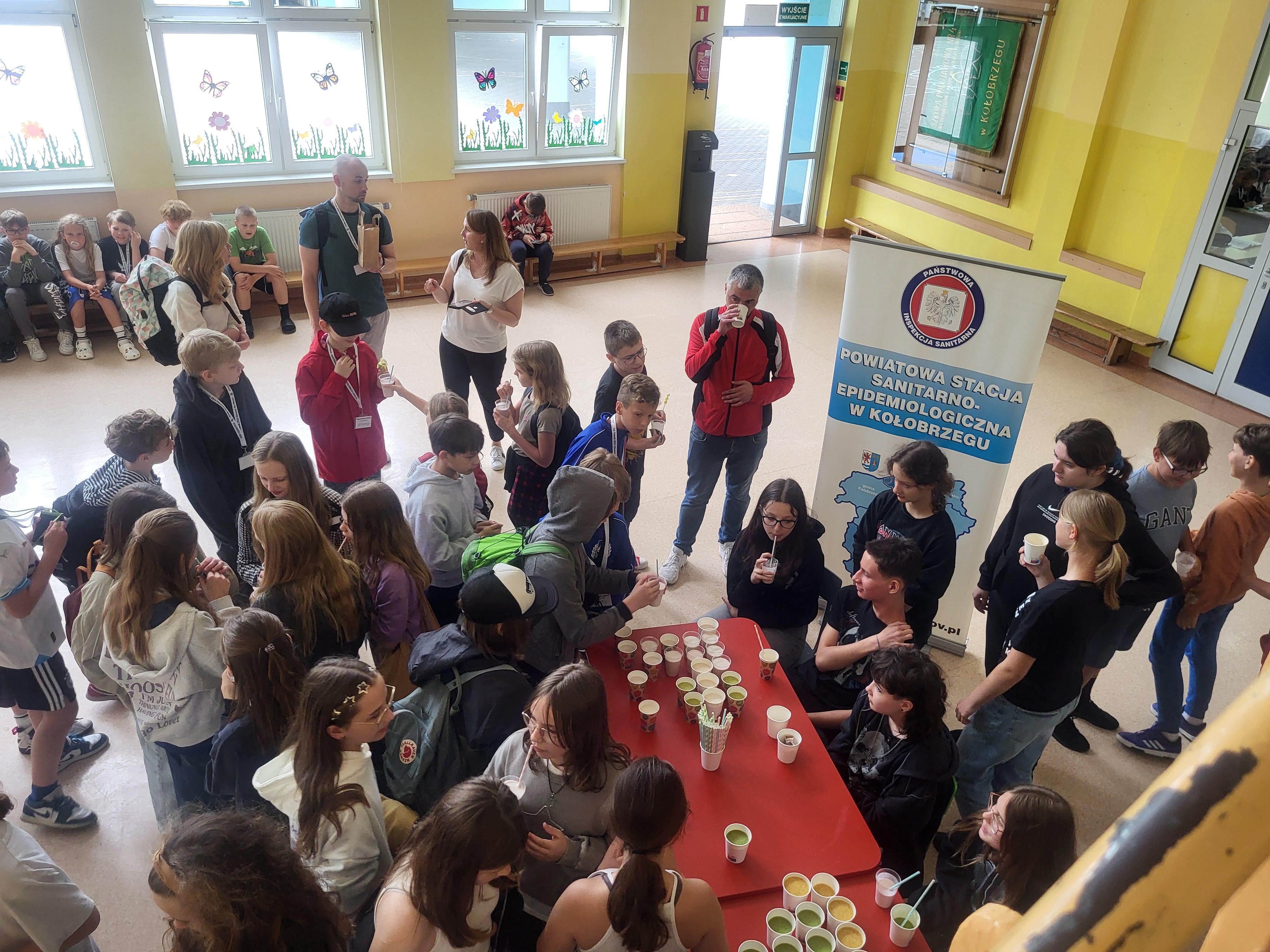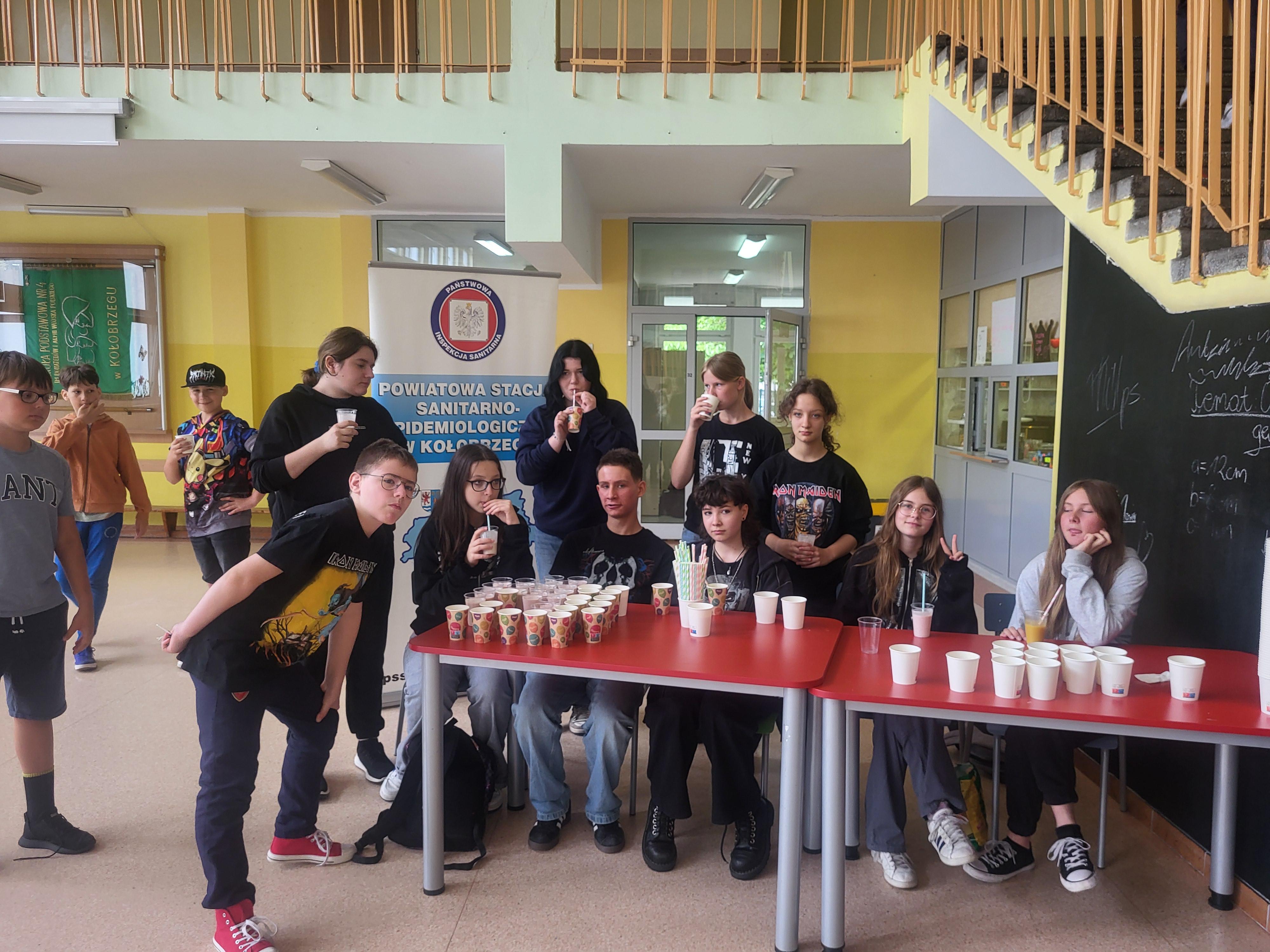 W ramach programu edukacyjnego Trzymaj Formę, Powiatowa Stacja Sanitarno-Epidemiologiczna w Kołobrzegu wzięła czynny udział w zajęciach teoretyczno-praktycznych w Szkole Podstawowej nr 4 w Kołobrzegu. Celem zajęć było kształtowanie prawidłowych nawyków żywieniowych wśród młodzieży oraz nauka współpracy. Młodzież z kl. VB oraz VII B wraz z nauczycielem Panem Maciejem Wachowskim przygotowywała koktajle owocowo-warzywne oraz mleczno-owocowe. Podczas przygotowywania młodzież pogłębiła wiedzę na temat składników pokarmowych oraz zawartości witamin w warzywach i owocach. Podczas zajęć kulinarnych obok nauki przygotowywania posiłków, równie ważne jest wyrabianie w dzieciach i młodzieży zdrowych nawyków żywieniowych. Przygotowane samodzielnie koktajle okazały się smaczną oraz zdrową bombą witaminową, którą mogli skosztować inni uczniowie szkoły oraz uczniowie z partnerskiej szkoły z Berlina.
