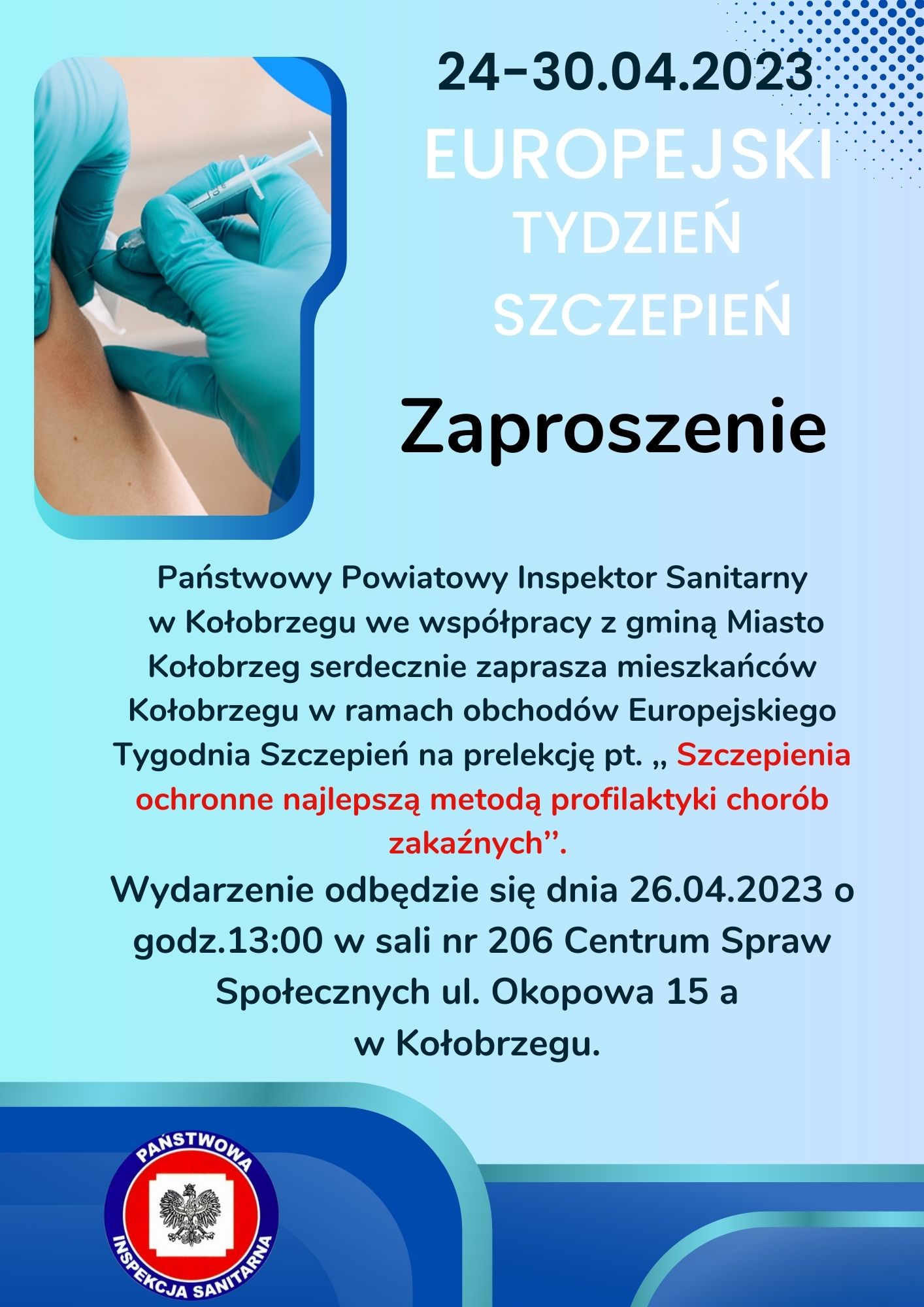 Państwowy Powiatowy Inspektor Sanitarny w Kołobrzegu we współpracy z gminą Miasto Kołobrzeg serdecznie zaprasza mieszkańców Kołobrzegu w ramach obchodów Europejskiego Tygodnia Szczepień na prelekcję pt. ,, Szczepienia ochronne najlepszą metodą profilaktyki chorób zakaźnych’’.