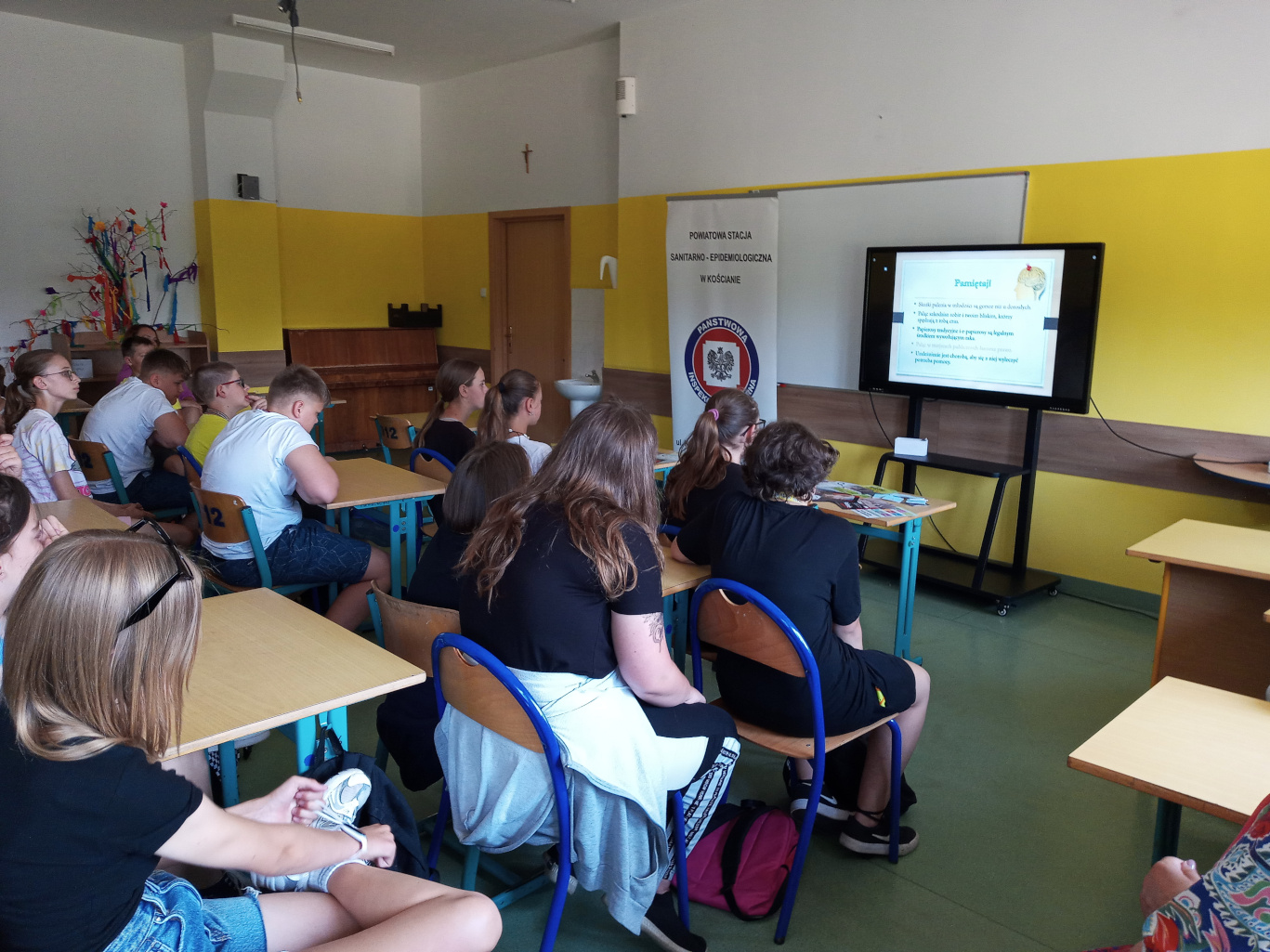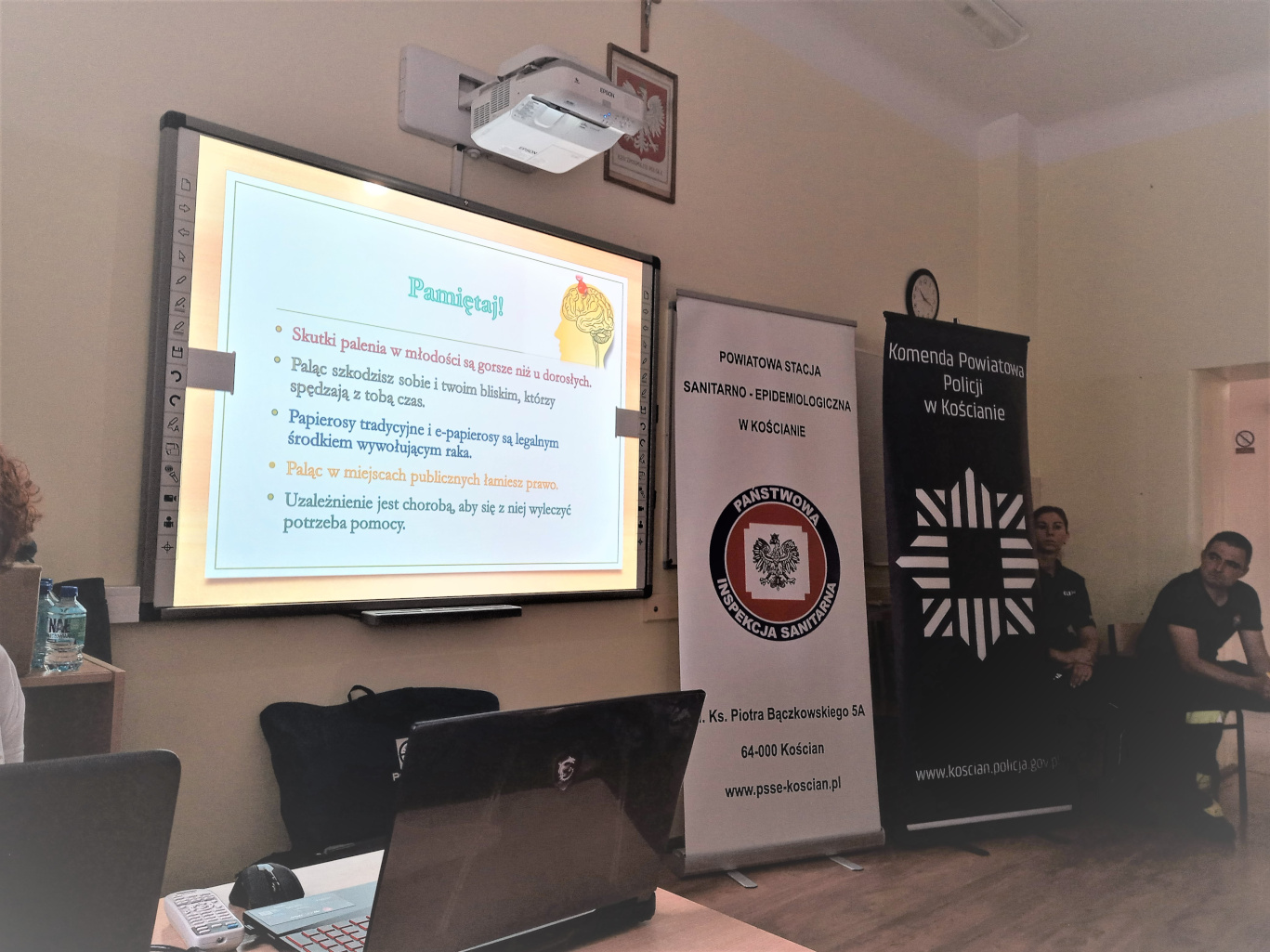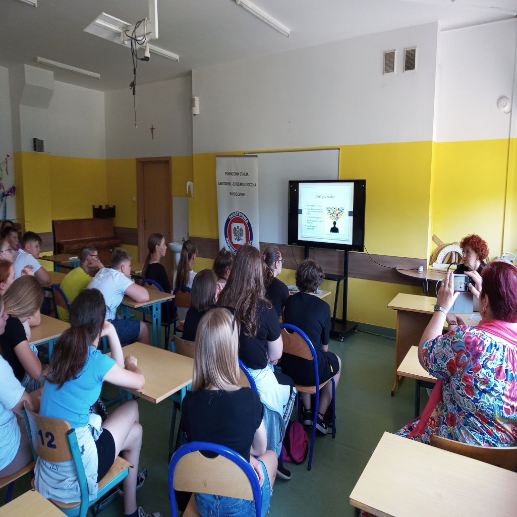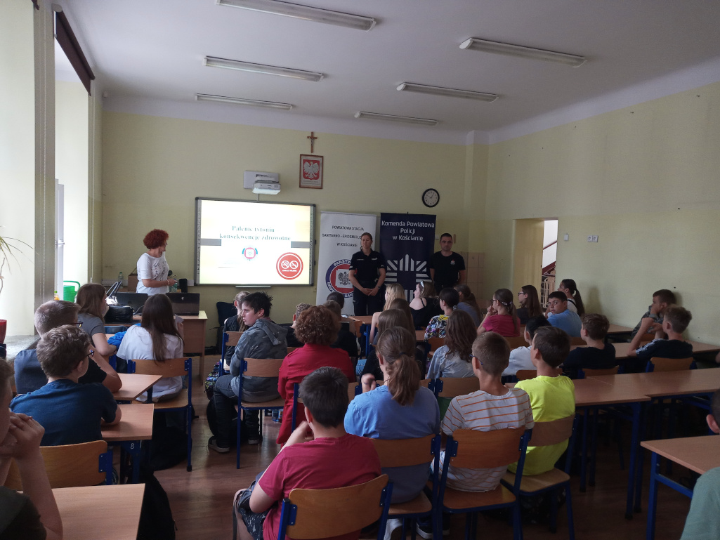 Pracownicy Stanowiska Pracy ds. Oświaty Zdrowotnej i Promocji Zdrowia PSSE w Kościanie podczas spotkań wygłosili prelekcję na temat konsekwencji zdrowotnych palenia tytoniu i inhalowania e-papierosów wobec organizmu palacza i osób z jego otoczenia. Uczniowie mogli zaopatrzyć się także w tematyczne ulotki dotyczące szkodliwości palenia tytoniu i inhalowania e-papierosów.