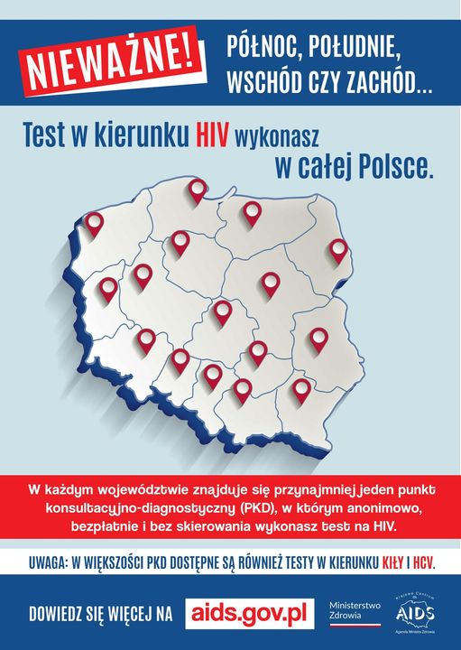 Punkty Konsultacyjno-Diagnostyczne działają we wszystkich województwach, a ich lista dostępna jest na stronie https://aids.gov.pl/pkd/