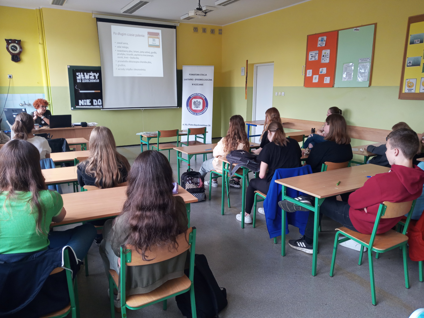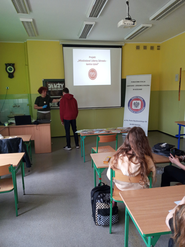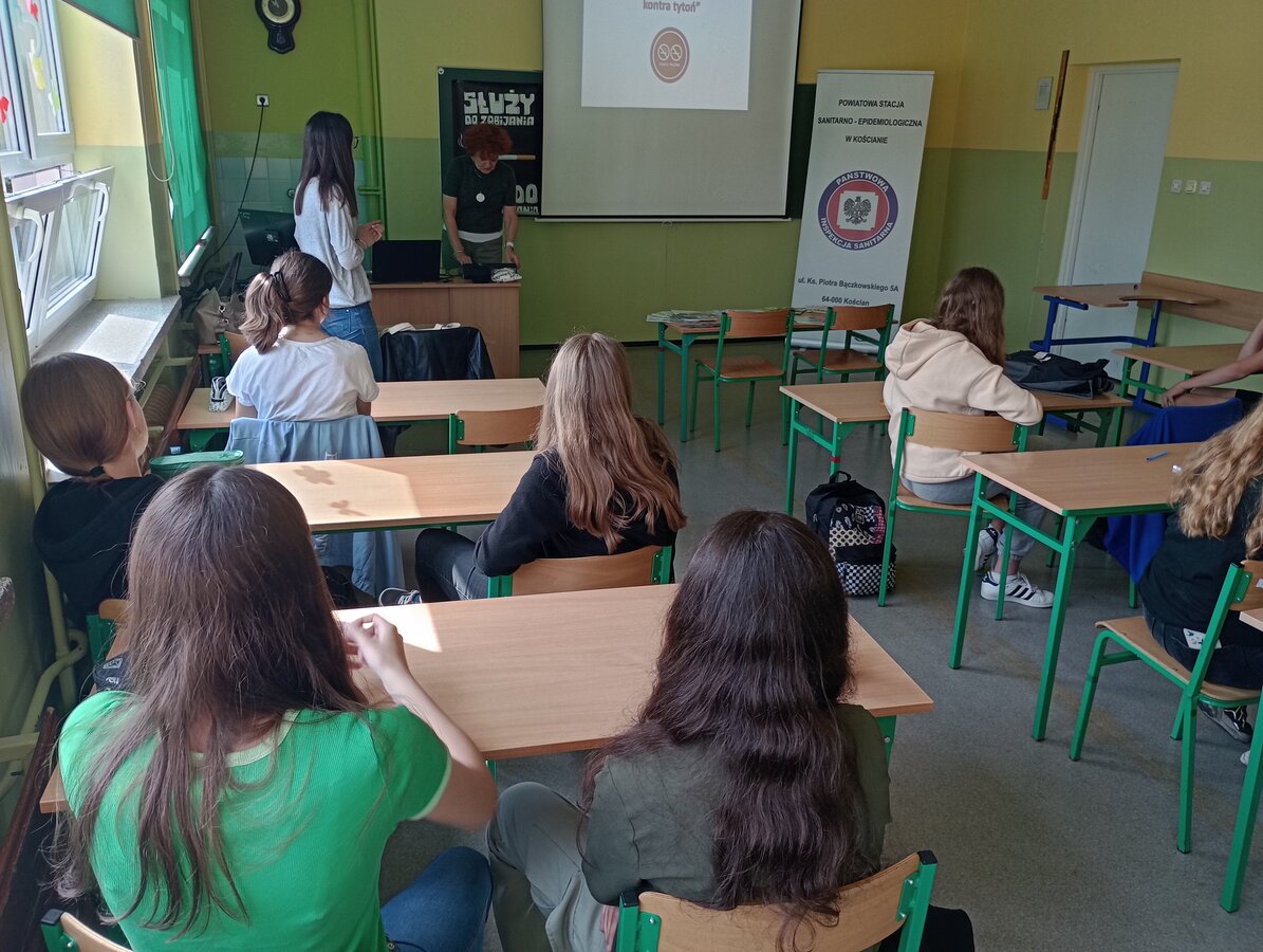 W dniu 14.06.2023 r., w ramach realizacji Projektu „Młodzieżowi Liderzy Zdrowia - kontra tytoń”, pracownicy Powiatowej Stacji Sanitarno-Epidemiologicznej w Kościanie przeprowadzili w Zespole Szkół w Jerce szkolenie dla uczniów z klas 8. Szkolenie połączone zostało z zajęciami warsztatowymi. Podczas spotkania przekazano informacje na temat szkodliwego wpływu palenia papierosów oraz inhalowania e-papierosów na organizm palacza i osób z jego otoczenia.