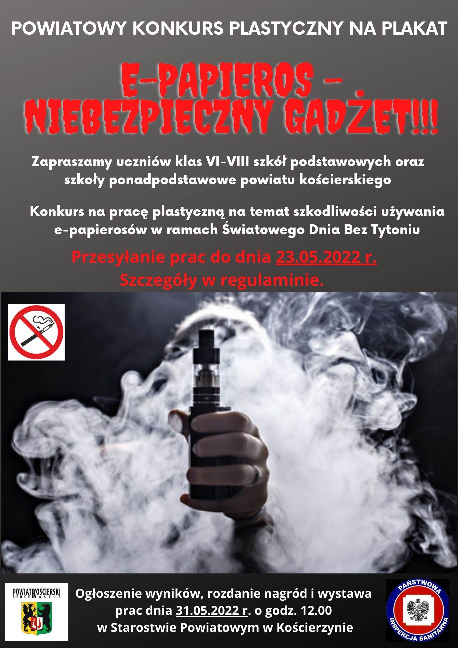 W związku ze zbliżającymi się obchodami Światowego Dnia Bez Tytoniu (31 maja 2022r.) Państwowy Powiatowy Inspektor Sanitarny w Kościerzynie oraz Starosta Powiatu Kościerskiego ogłaszają powiatowy konkurs plastyczny na plakat pod hasłem „E-papieros – niebezpieczny gadżet”. Konkurs skierowany jest do uczniów klas VI-VIII szkół podstawowych oraz szkół ponadgimnazjalnych na terenie powiatu kościerskiego.
