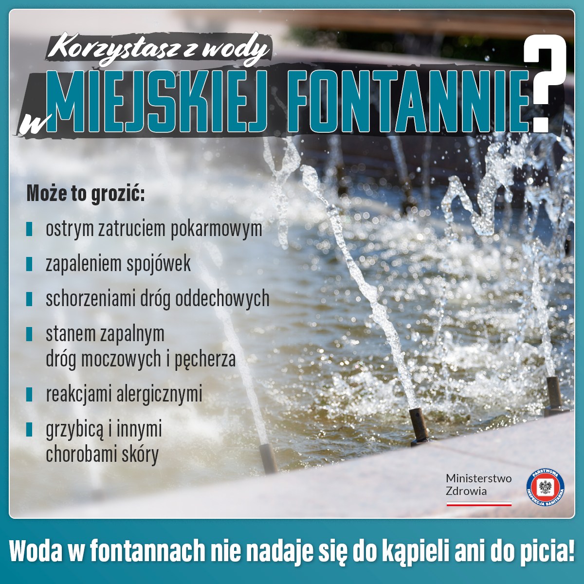 Kąpiel w fontannie miejskiej może wydawać się świetną rozrywką zarówno dla dzieci, jak i dla dorosłych. Jednak woda w fontannie tylko z pozoru wydaje się czysta, w rzeczywistości jednak nie nadaje się do mycia, a tym bardziej do spożywania, ponieważ może być szkodliwa dla zdrowia. Kąpiele w fontannie są szczególnie niebezpieczne dla małych dzieci, których układ odpornościowy nie jest jeszcze w pełni rozwinięty, by móc zwalczyć infekcję.