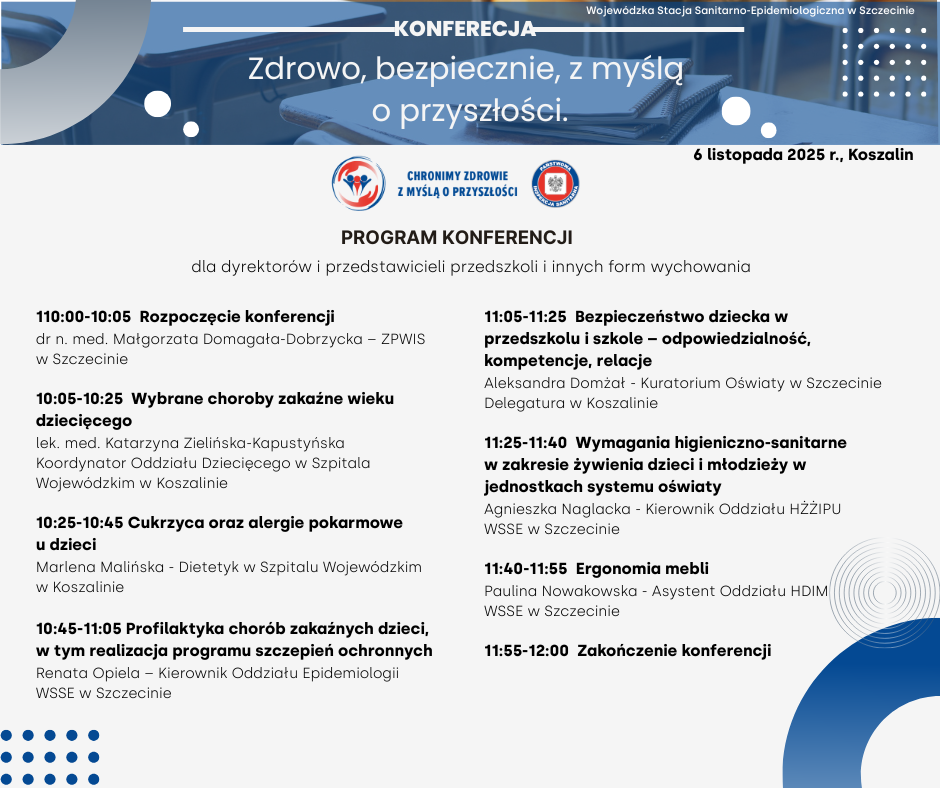 w konferencjach stacjonarnych pod hasłem "Zdrowo, bezpiecznie, z myślą o przyszłości", organizowanych przez Zachodniopomorskiego Państwowego Wojewódzkiego Inspektora Sanitarnego w Szczecinie.