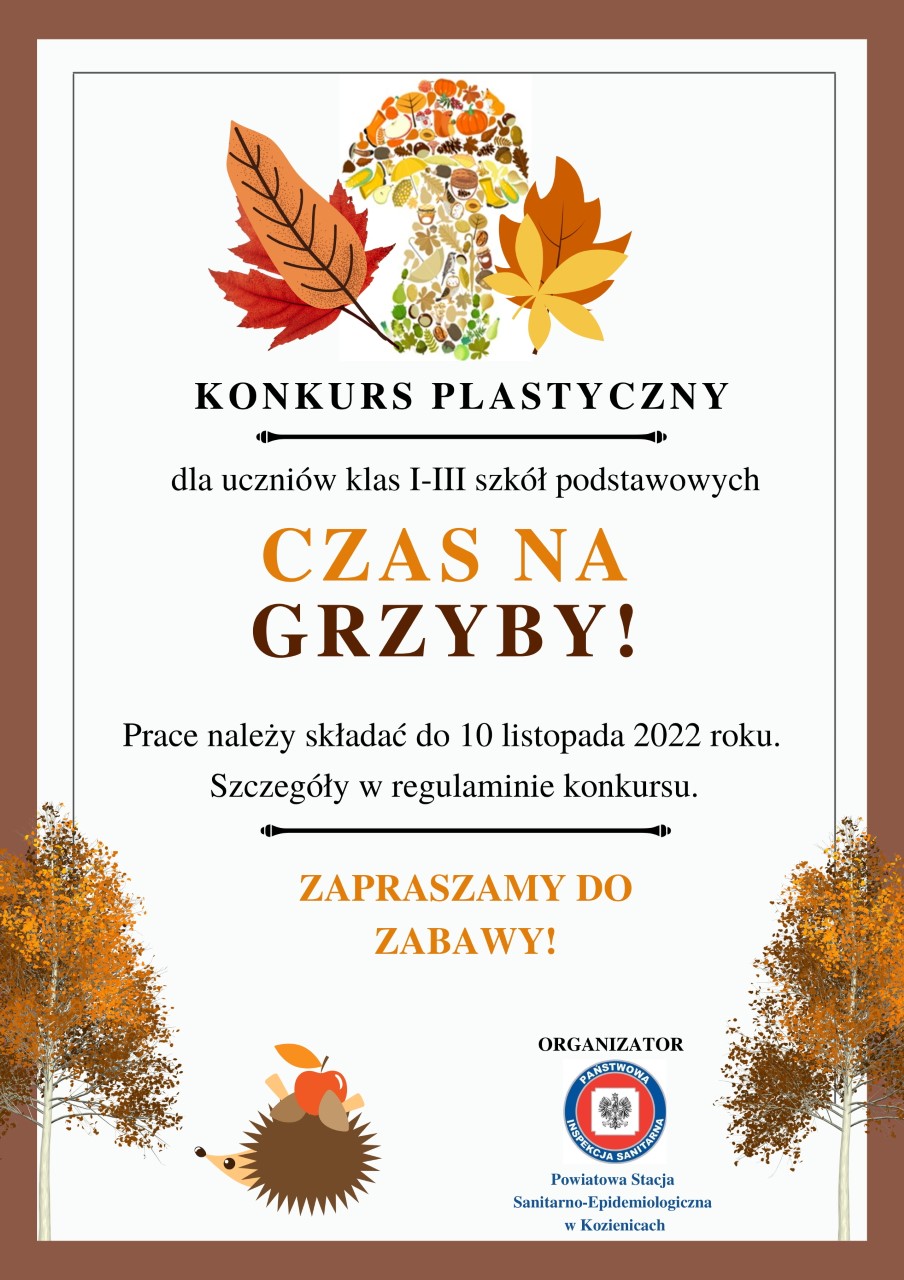 Państwowy Powiatowy Inspektor Sanitarny w Kozienicach serdecznie zaprasza wszystkich uczniów klas 1-3 szkół podstawowych z terenu powiatu kozienickiego do wzięcia udziału w powiatowym konkursie plastycznym pod hasłem „Czas na grzyby!”.