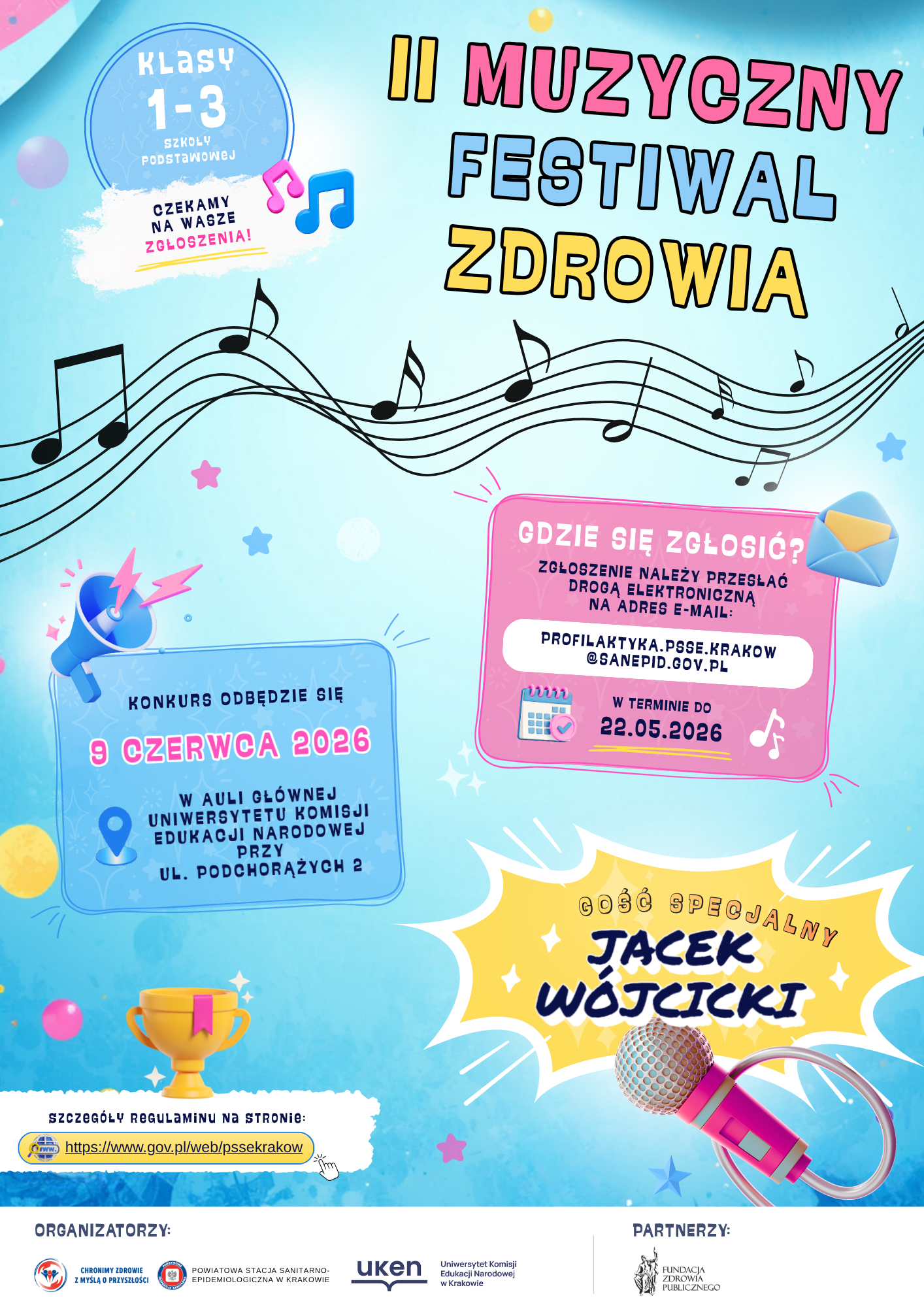 Państwowy Powiatowy Inspektor Sanitarny w Krakowie serdecznie zaprasza do udziału w konkursie „II Muzyczny Festiwal Zdrowia”, organizowanym przez Powiatową Stację Sanitarno-Epidemiologiczną w Krakowie wraz z Uniwersytetem Komisji Edukacji Narodowej w Krakowie.
