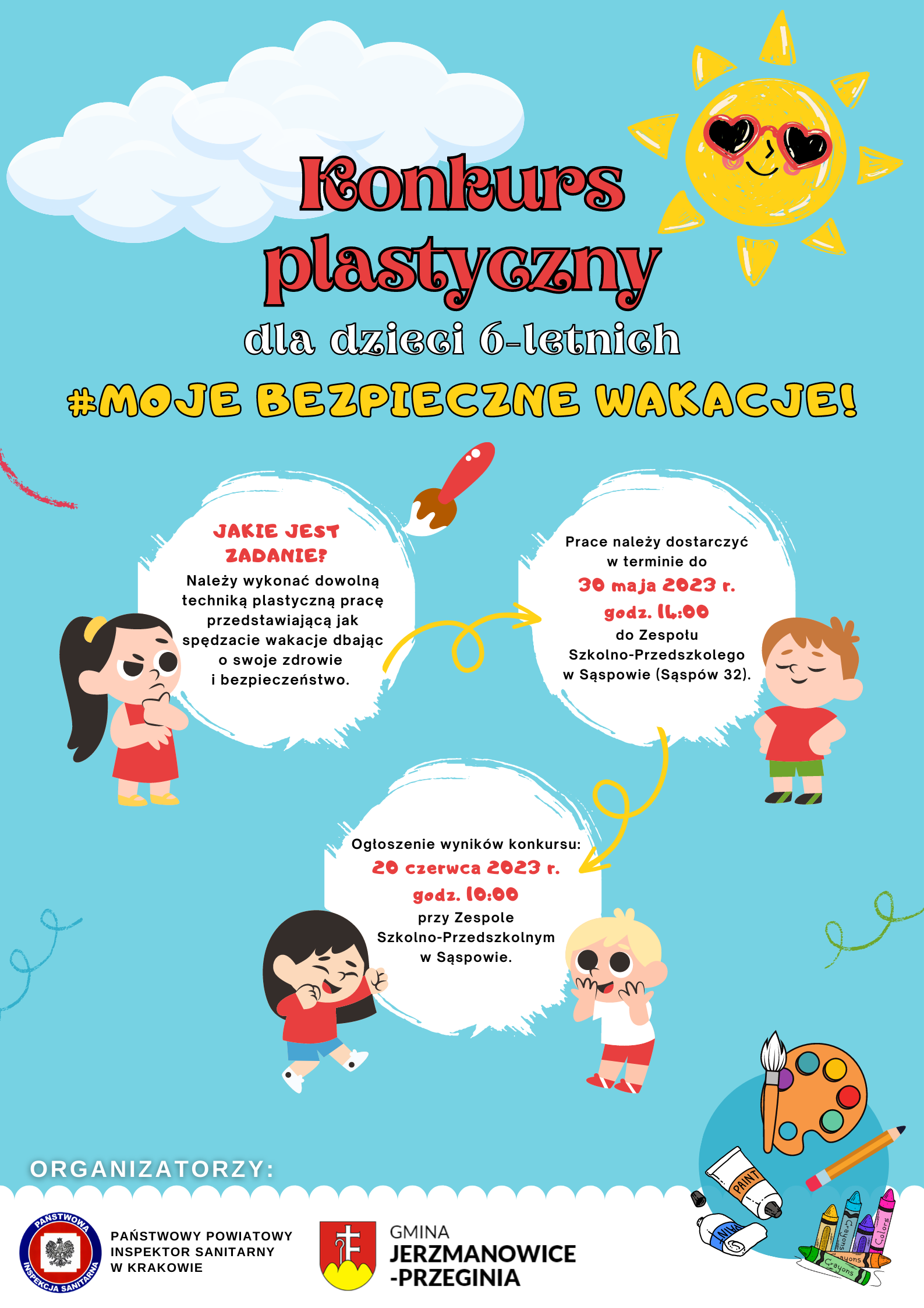 Państwowy Powiatowy Inspektor Sanitarny w Krakowie oraz Wójt Gminy Jerzmanowice-Przeginia zapraszają do udziału w konkursie plastycznym „#Moje bezpieczne wakacje!”. Uczestnikami konkursu mogą być dzieci w wieku 6 lat, uczęszczające do przedszkoli lub oddziałów przedszkolnych w szkołach podstawowych z terenu Gminy Jerzmanowice-Przeginia.