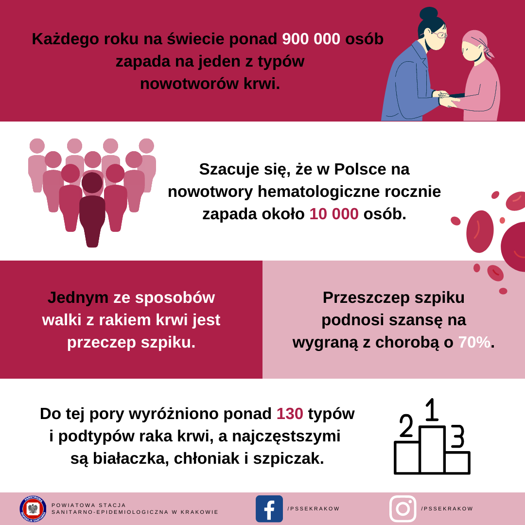 Państwowy Powiatowy Inspektor Sanitarny w Krakowie przypomina, że 28 maja obchodzimy Światowy Dzień Walki z Nowotworami Krwi. Symbolem tego dnia jest czerwony znak & wyrażający solidarność z osobami cierpiącymi na tego typu choroby. Znak łączy ludzi: pacjentów, ich rodziny, przyjaciół, a także dawców.