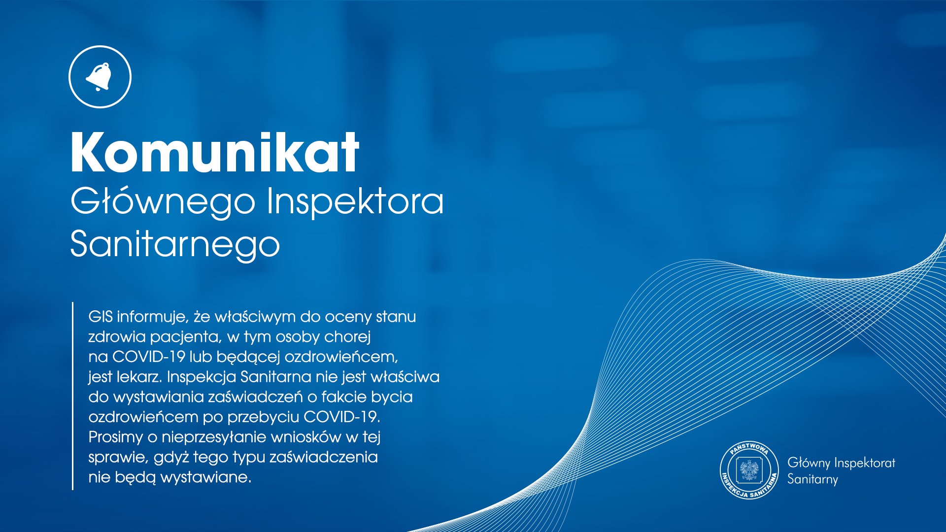 GIS informuje, że właściwym do oceny stanu zdrowia pacjenta, w tym osoby chorej na COVID-19 lub będącej ozdrowieńcem jest lekarz. Inspekcja Sanitarna nie jest właściwa do wystawiania zaświadczeń o fakcie bycia ozdrowieńcem po przebyciu COVID-19. Prosimy o nieprzesyłanie wniosków w tej sprawie, gdyż tego typu zaświadczenia nie będą wystawiane.