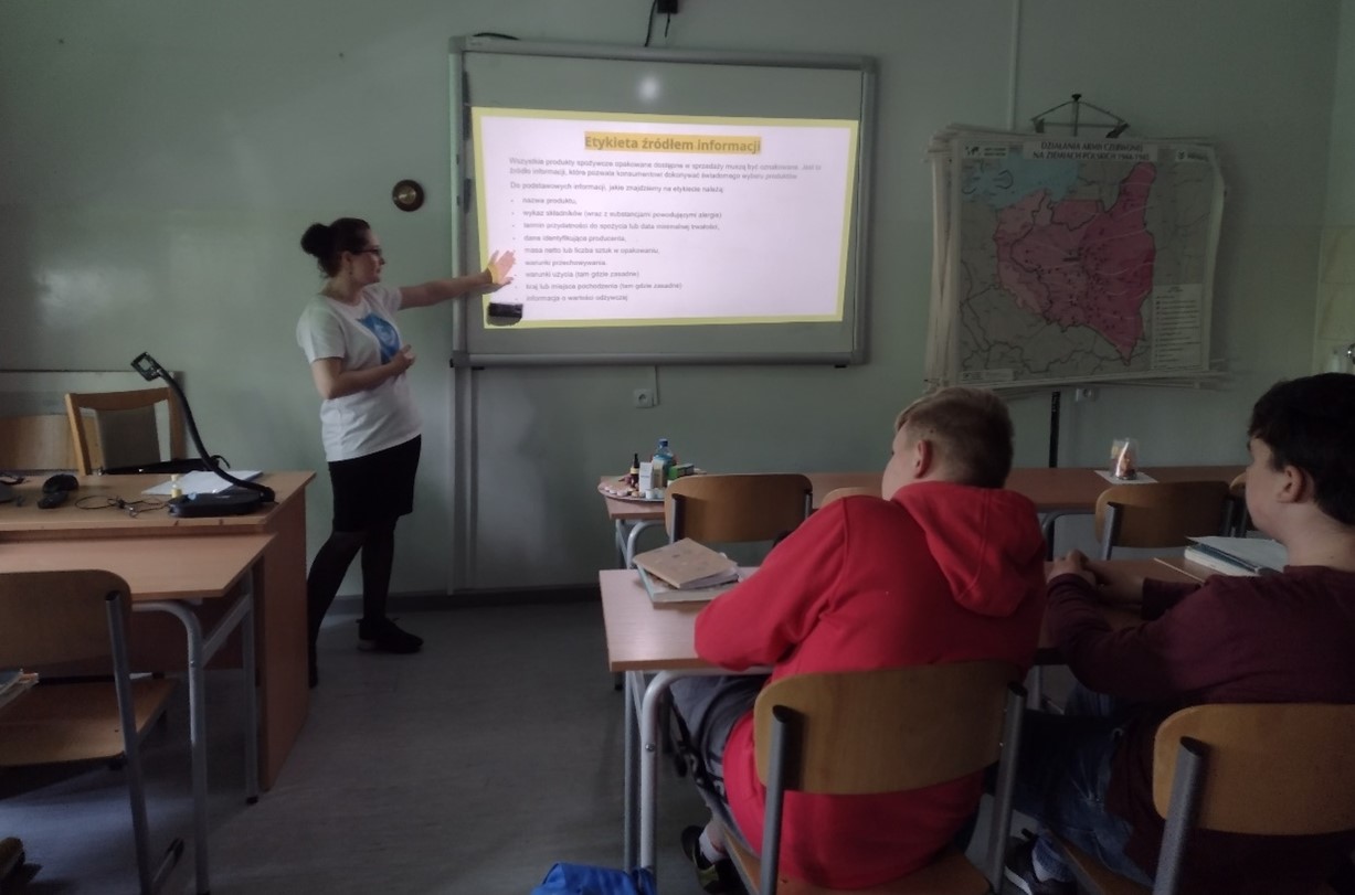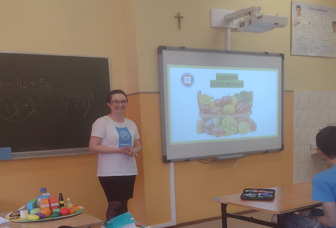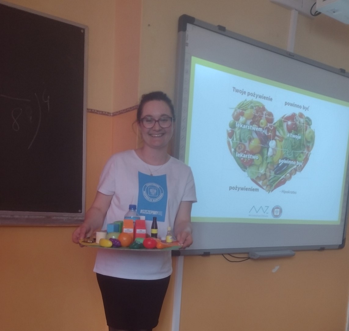 Dnia 17 maja 2022r. przeprowadzono prelekcję w Szkole Podstawowej im. Wł. St. Reymonta w Gołębiewku dla uczniów dwóch klas VII, gdzie tematem przewodnim było zdrowe odżywianie. Na podstawie talerza zdrowia przedstawiono jak ważne jest spożywanie warzyw i owoców. Mówiono również o tym, że warto zamieniać np.: słodkie napoje na wodę, tłuszcze zwierzęce na roślinne oraz przetworzone produkty zbożowe na pełnoziarniste. Młodzież mogła przypomnieć sobie informacje dlaczego ważne jest picie wody, która m.in. wpływa na zachowanie dobrej kondycji fizycznej i psychicznej. Podkreślono również, żeby pamiętać o aktywności fizycznej, która służy pomnażaniu oraz zachowaniu zdrowia. Podczas spotkania zaznaczono, że należy czytać etykiety produktów spożywczych ponieważ są one źródłem informacji zarówno o wykazie składników jak i wartości odżywczej.