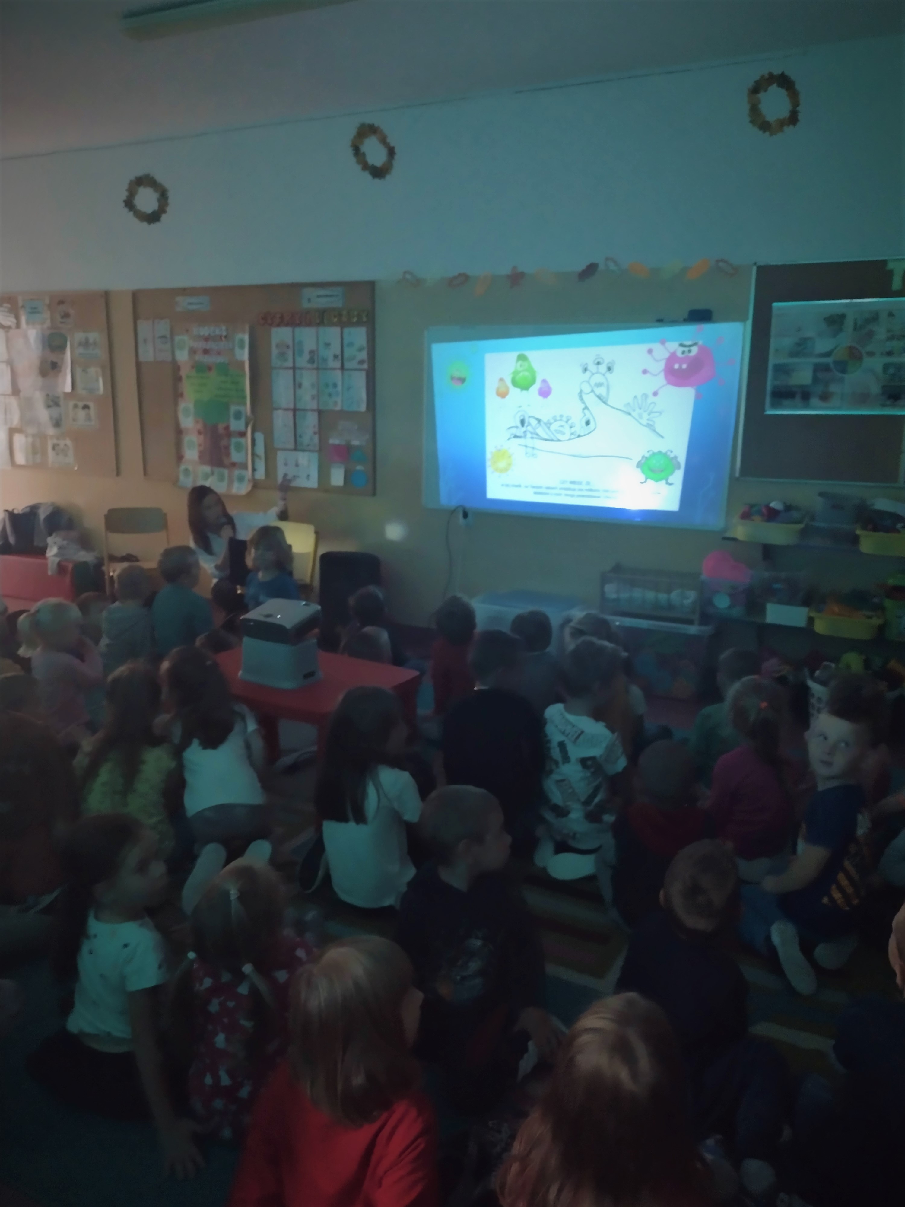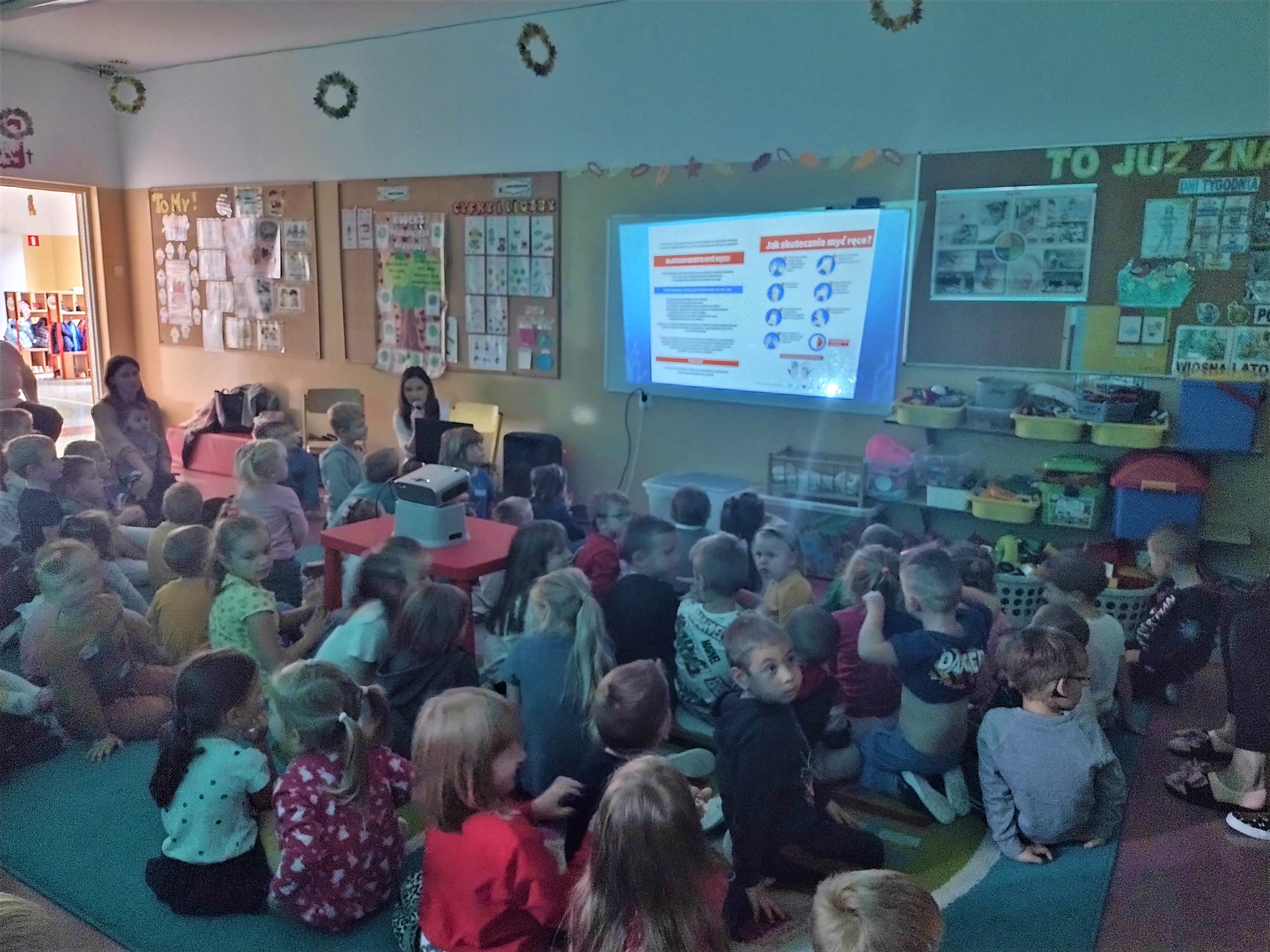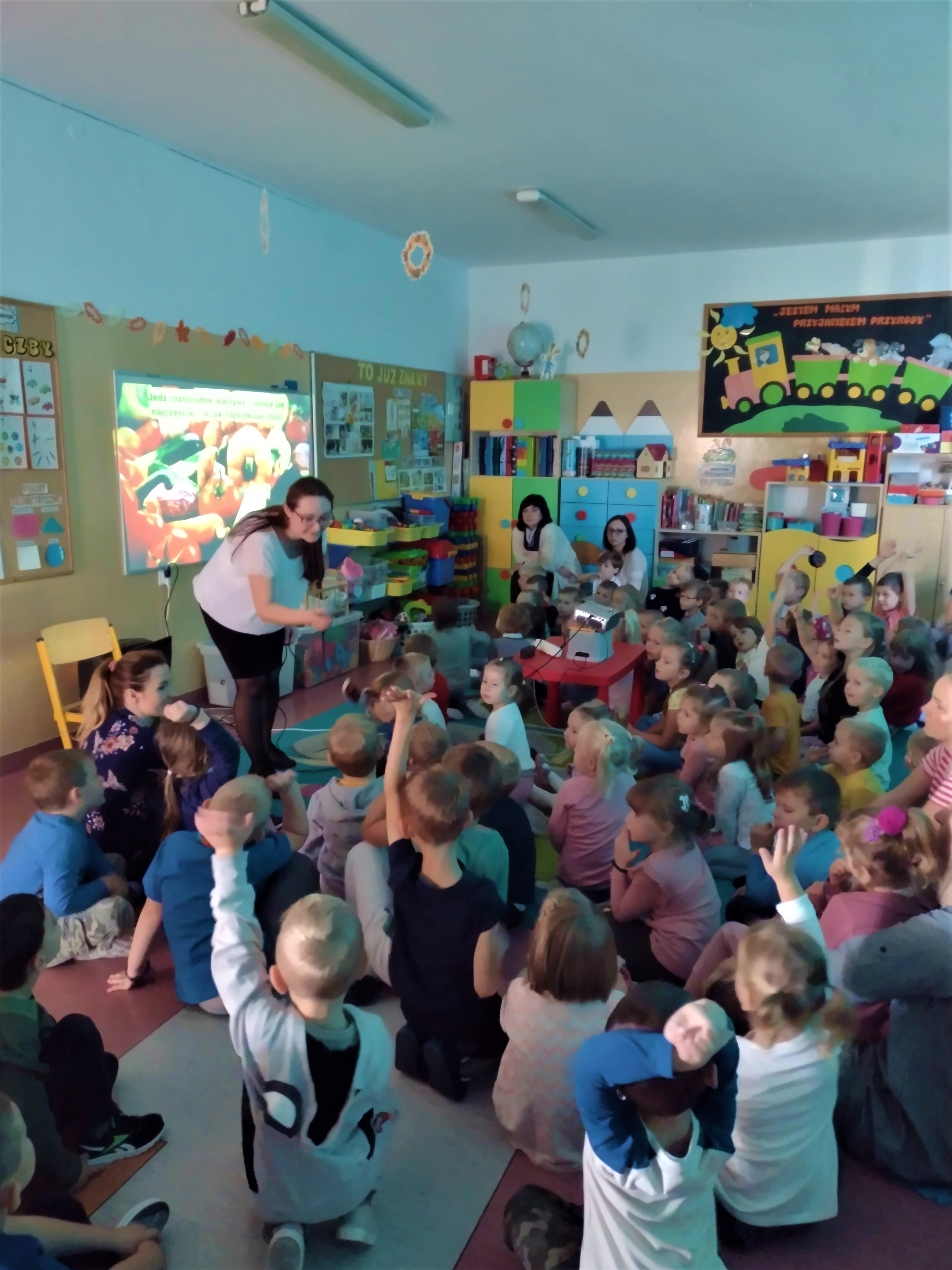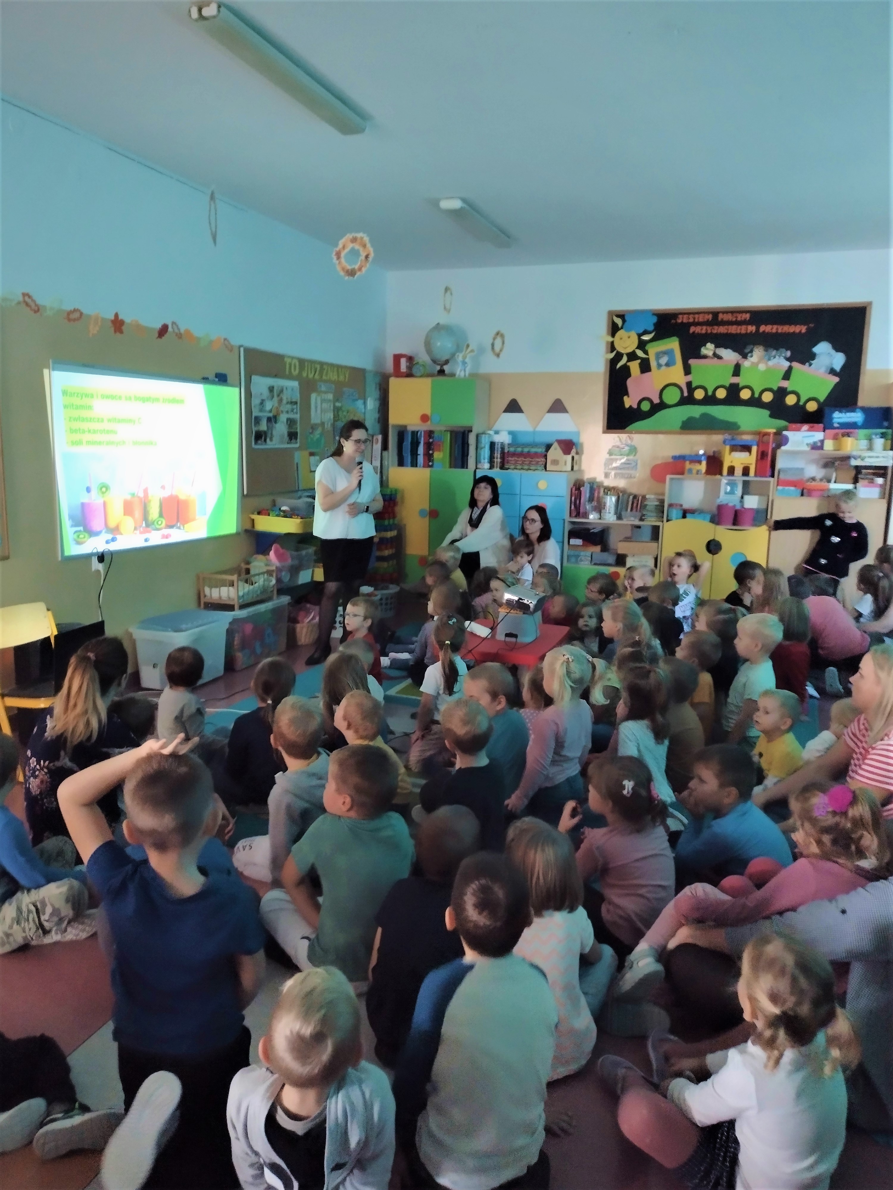 W Gminnym Przedszkolu w Strzelcach dnia 28.09.2022 r. pracownice Oświaty Zdrowotnej i Promocji Zdrowia Powiatowej Stacji Sanitarno-Epidemiologicznej w Kutnie zaprezentowały prelekcję na temat zdrowego odżywiania. Omówiono również jakie są objawy przeziębienia i grypy oraz zaprezentowano dzieciom jak prawidłowo myć ręce. Przedszkolaki bardzo chętnie włączały się do rozmowy na temat roli warzyw i owoców w codziennej diecie oraz mówiły jak chronić się przed wirusami i bakteriami.