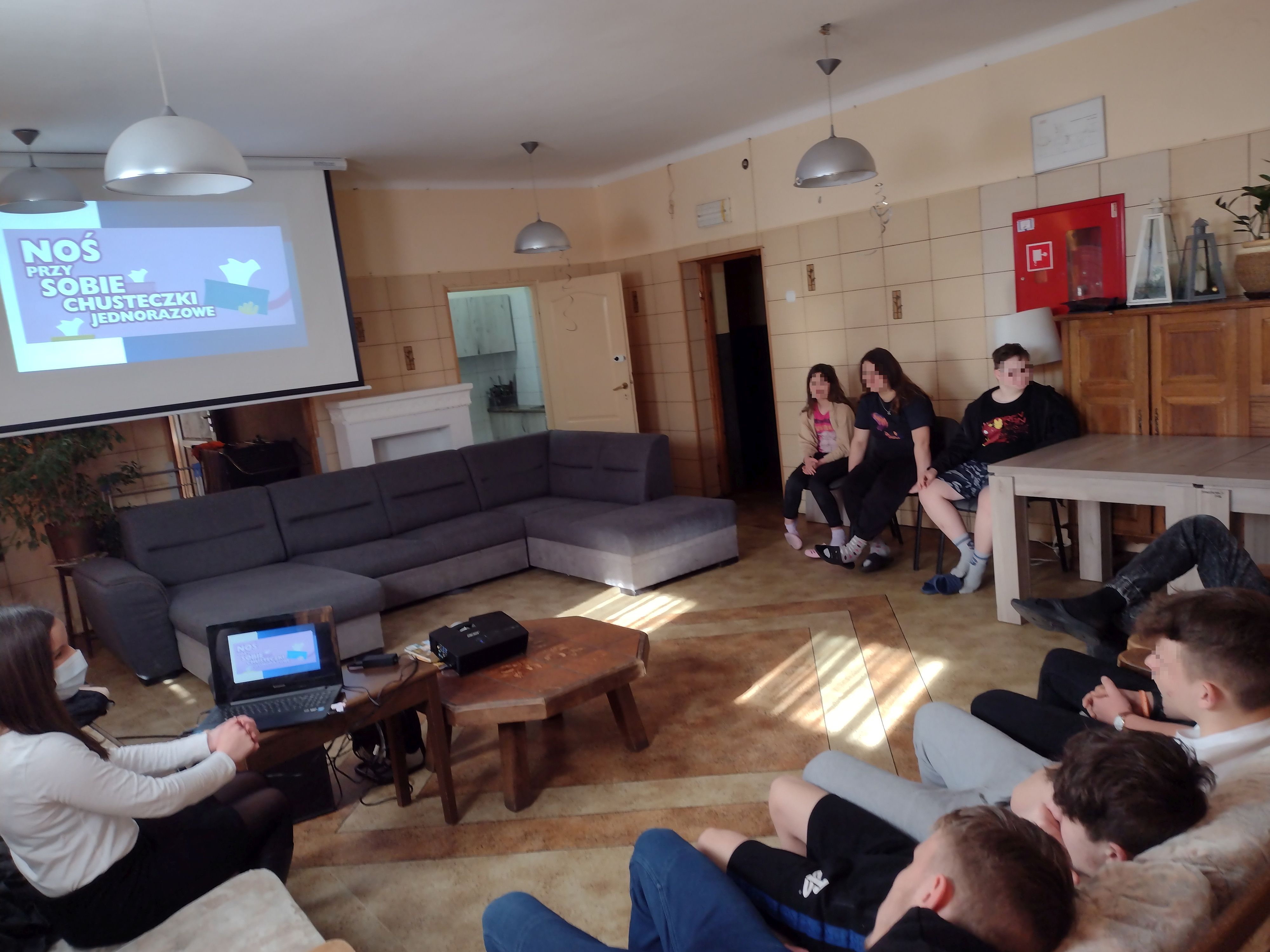 Ponadto omówione zostały choroby zakaźne – grypa jako najczęstsza infekcja występująca na przełomie od miesiąca października do kwietnia oraz obecnie panująca pandemia koronawirusa SARS-CoV-2, czyli choroba COVID-19. Wychowankowie potrafią odróżnić pojęcia tj. epidemia a pandemia. Celem spotkania było przypomnienie obowiązujących zasad jako najlepszy sposób ochrony przed wirusami. Swoim zachowaniem możemy przyczynić się do tego, aby choroba COVID-19 skończyła się jak najszybciej i dotknęła jak najmniejszą liczbę ludzi, dlatego często myj ręce, dezynfekuj powierzchnie i przedmioty w swoim mieszkaniu, zachowuj odstęp od innych ludzi w miejscach publicznych, osłaniaj twarz maską. Na koniec spotkania uczestnicy obejrzeli film pt. „WIRUS, który zmienił świat! Covid-19”.