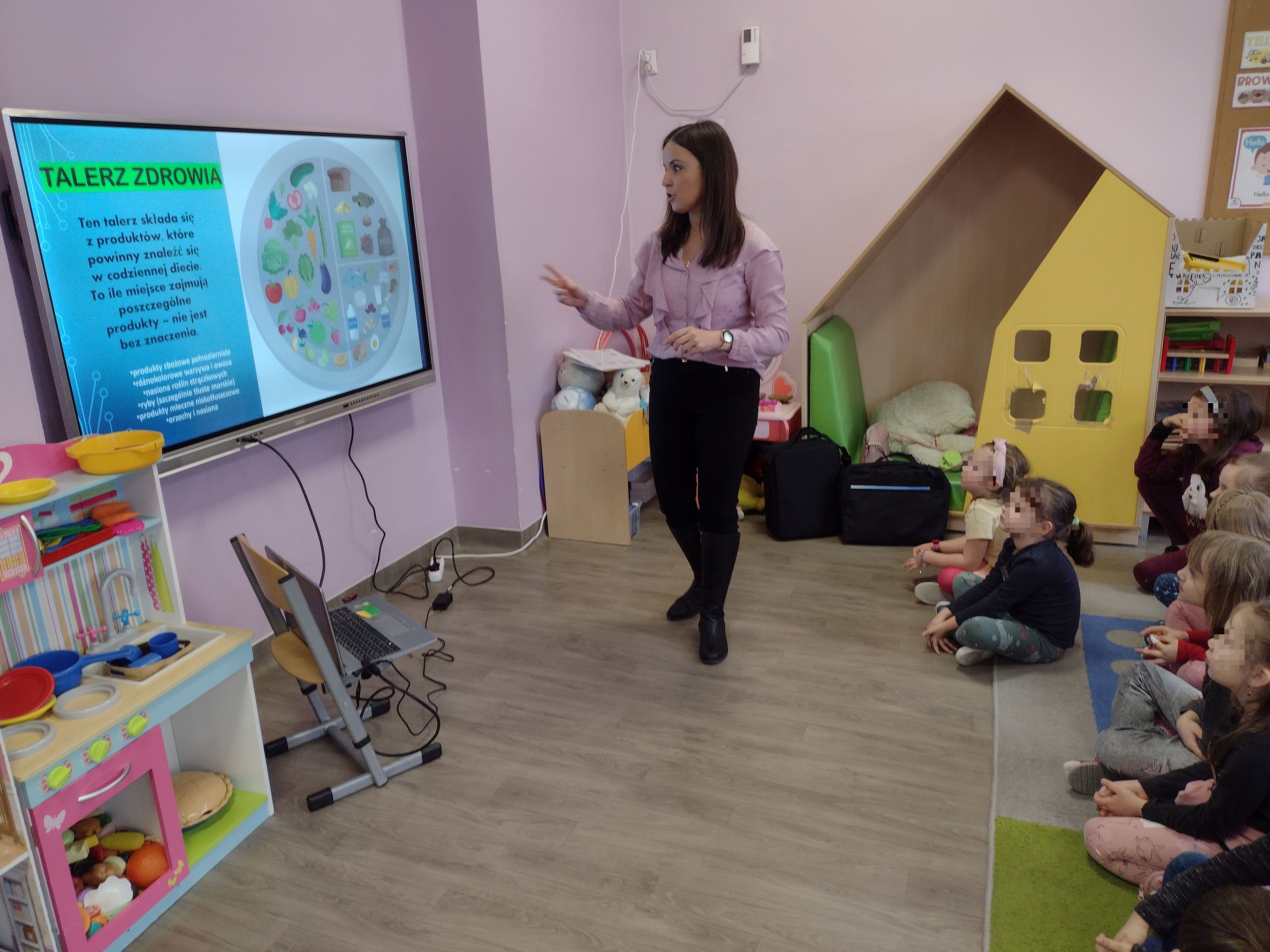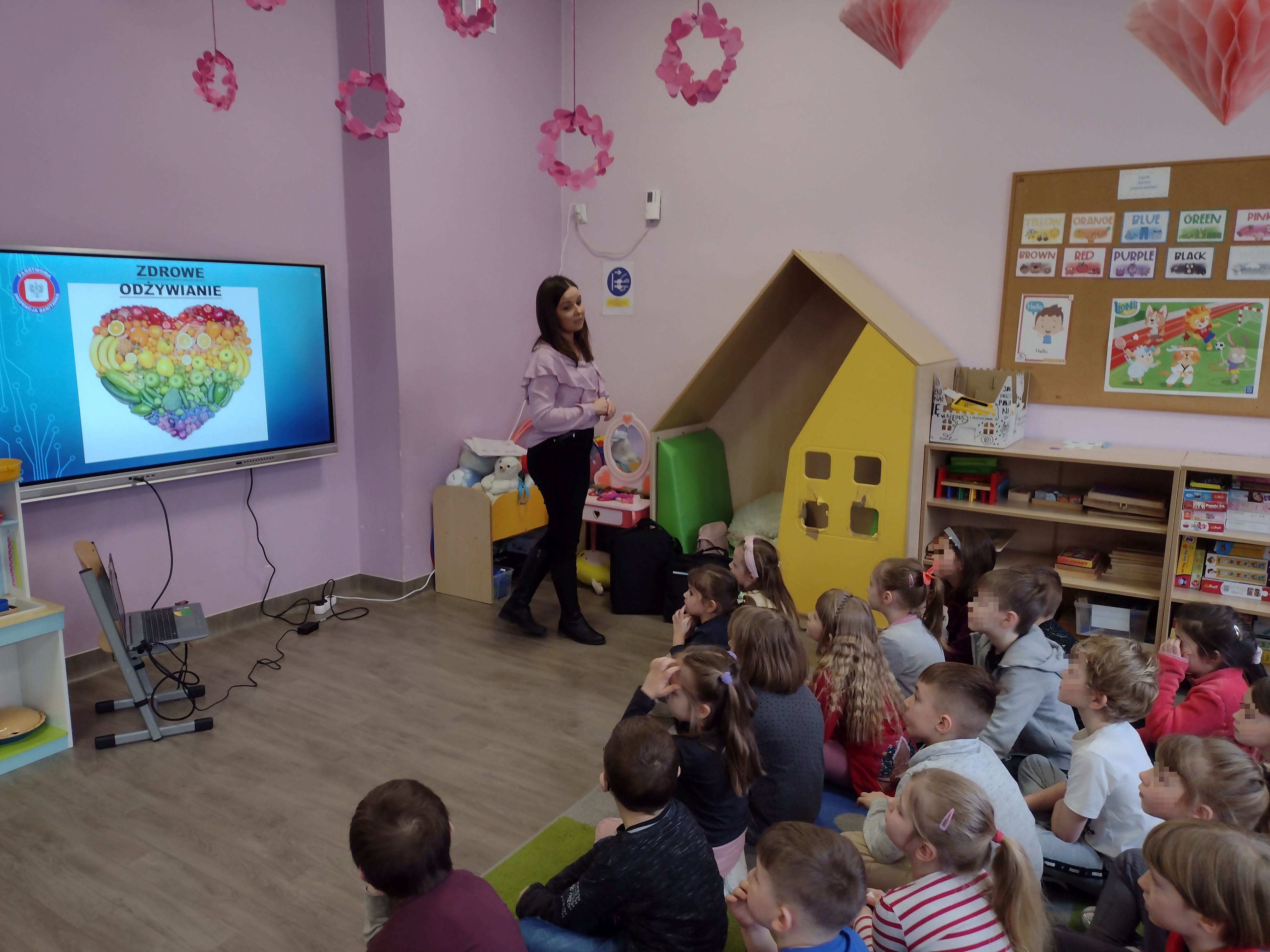 W dniu 02.03.2023 r. pracownica Oświaty Zdrowotnej i Promocji Zdrowia Powiatowej Stacji Sanitarno-Epidemiologicznej w Kutnie przeprowadziła prelekcję dla dzieci z Oddziału „0” zlokalizowanego w budynku Szkoły Podstawowej nr 9 w Kutnie. Podczas spotkania omówione zostały zasady zdrowego odżywiania a w nim różnorodność spożywanych posiłków jako źródło cennych składników odżywczych. Dzieci bardzo chętnie włączały się do rozmowy na temat roli warzyw i owoców w codziennej diecie oraz mówiły jak chronić się przed wirusami i bakteriami Omówiono również jakie są objawy przeziębienia i grypy oraz zaprezentowano dzieciom jak prawidłowo myć ręce.