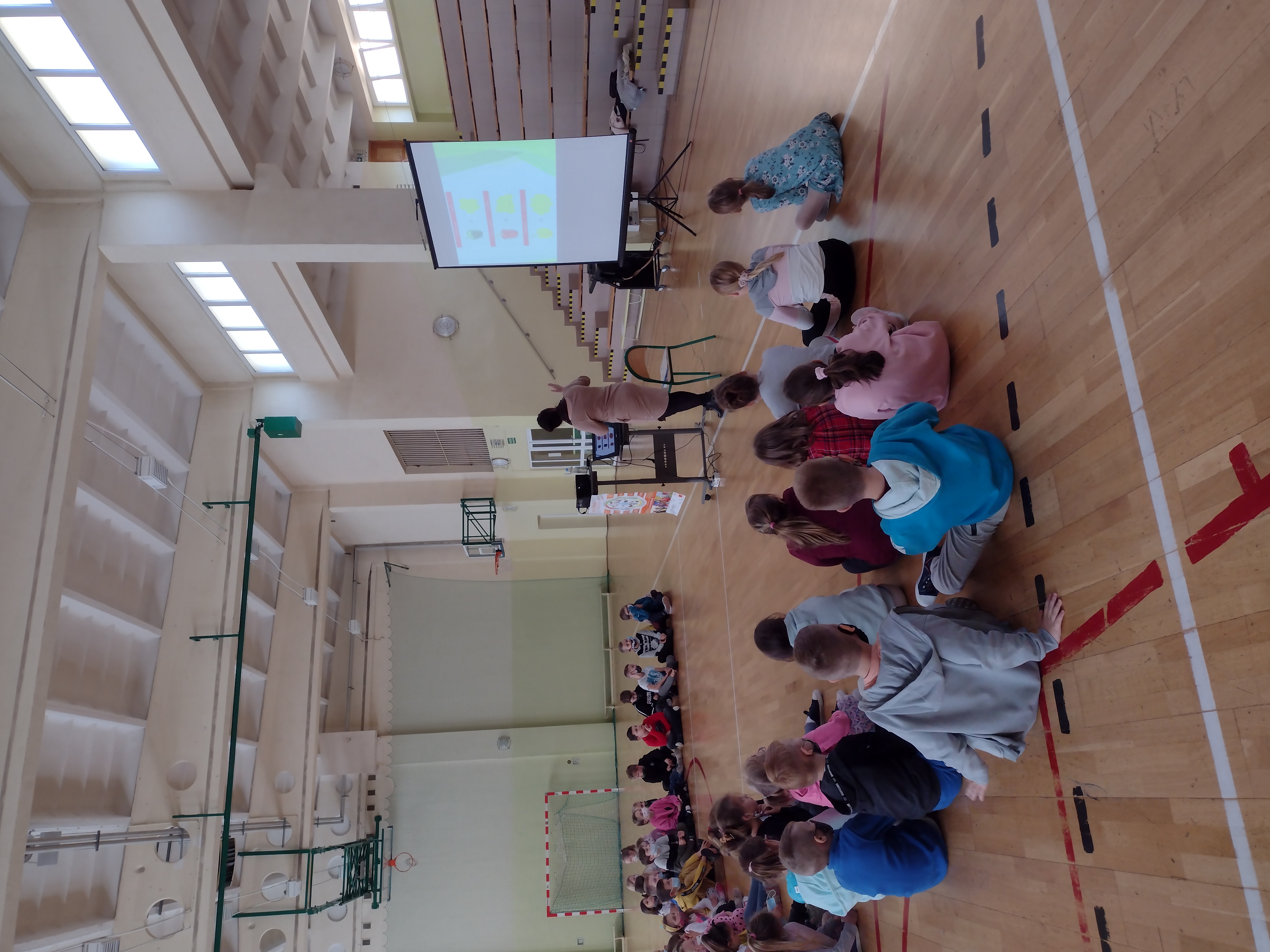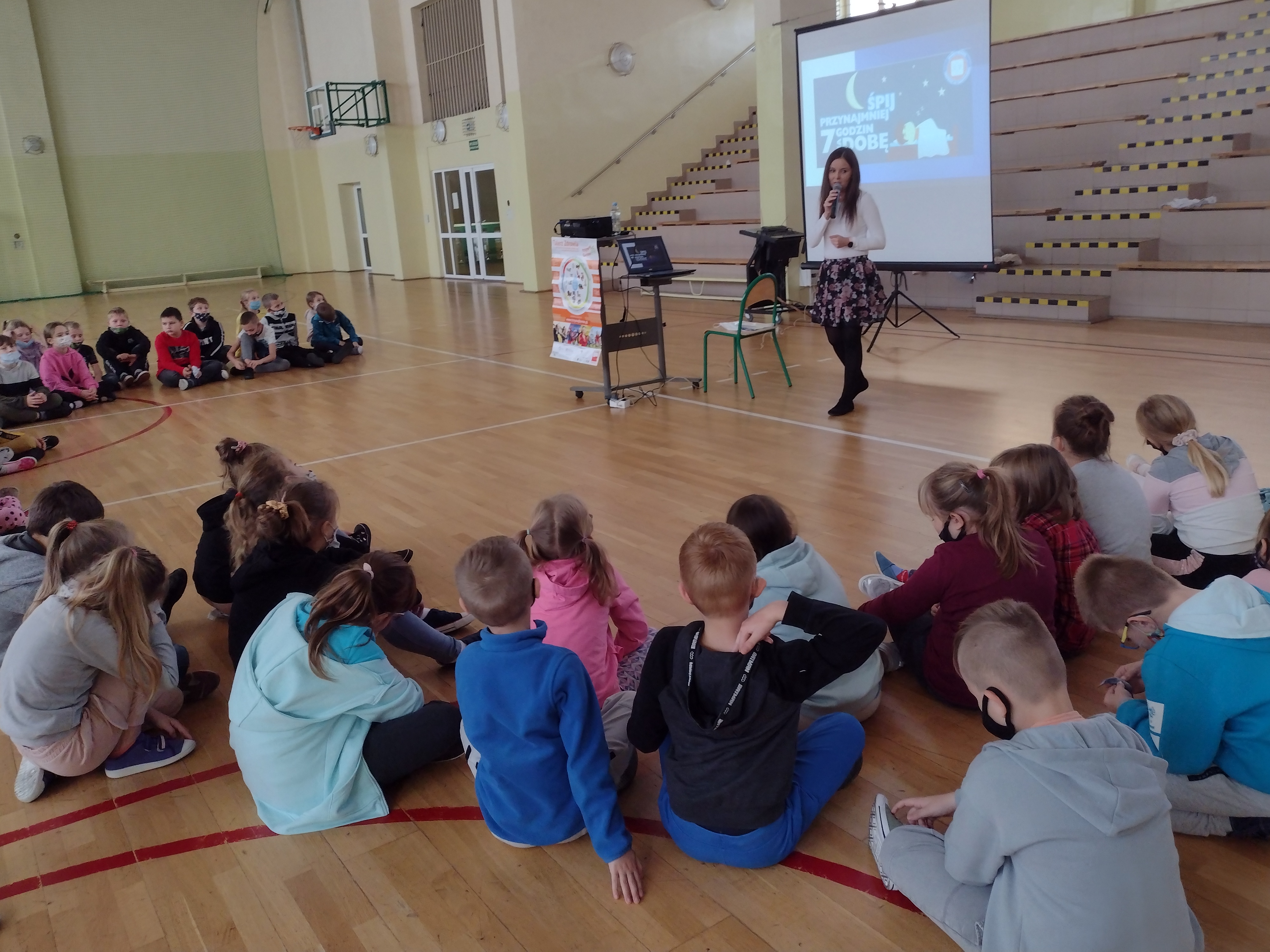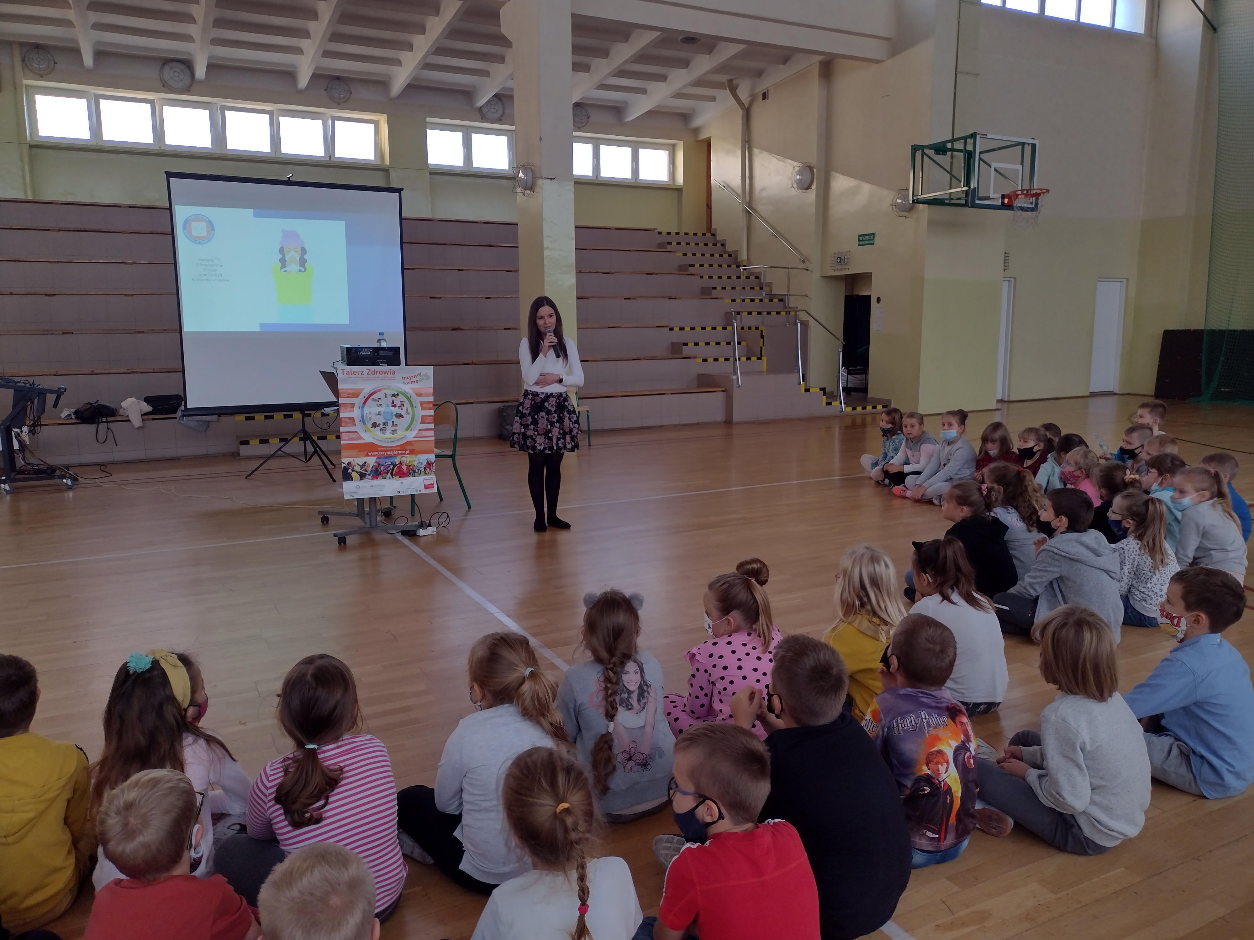 Tematyka przeprowadzonych prelekcji dotyczyła przestrzegania podstawowych zasad higieny osobistej, bezpiecznego i zdrowego stylu życia, zdrowego odżywiania, aktywności fizycznej oraz kształtowania nawyków prozdrowotnych na przykładzie talerza zdrowia. Prezentacja o zdrowym odżywianiu miała na celu zwiększenie świadomości wpływu żywienia i aktywności fizycznej na zdrowie. Dzieci zapoznały się z piramidą zdrowego żywienia i stylu życia oraz talerzem zdrowia. Mówiono o tym, że warzywa i owoce, zgodnie z aktualnymi zaleceniami zawartymi w Piramidzie Zdrowego Żywienia i Aktywności Fizycznej, powinny być podstawą naszej diety. Warzywa i owoce są bogatym źródłem witamin: zwłaszcza witaminy C, beta-karotenu, soli mineralnych i błonnika. Przypomniano dzieciom o piciu co najmniej 3-4 szklanek mleka dziennie. Mleko i przetwory mleczne są źródłem łatwo przyswajalnego wapnia, na które zapotrzebowanie w okresie intensywnego wzrostu jest wysokie. Rozmawiano o tym aby słodkie napoje zastąpić wodą. Woda usuwa zbędne produkty przemiany materii oraz związki toksyczne z organizmu. Ma ona także udział w procesie regulacji temperatury ciała. Służy też jako materiał budulcowy, gdyż stanowi strukturalną część wszystkich komórek i tkanek. Mówiono również o aktywność fizycznej, która znalazła się w podstawie piramidy, aby przypominać o potrzebie codziennego ruchu. Wpływa on korzystnie na kondycję fizyczną i sprawność umysłową oraz prawidłową sylwetkę. Dzieciom i młodzieży zaleca się co najmniej 60 minut dziennie. Ruch rozwija mięśnie, wpływa na prawidłowy wzrost i kształt kości, rozwija układ krążeniowo-oddechowy, podnosi sprawność i wydolność fizyczną. Dzieci bardzo chętnie włączały się w rozmowę, mówiły jakie warzywa i owoce lubią jeść oraz wiedziały co się dzieje z nami gdy mamy za mało ruchu.