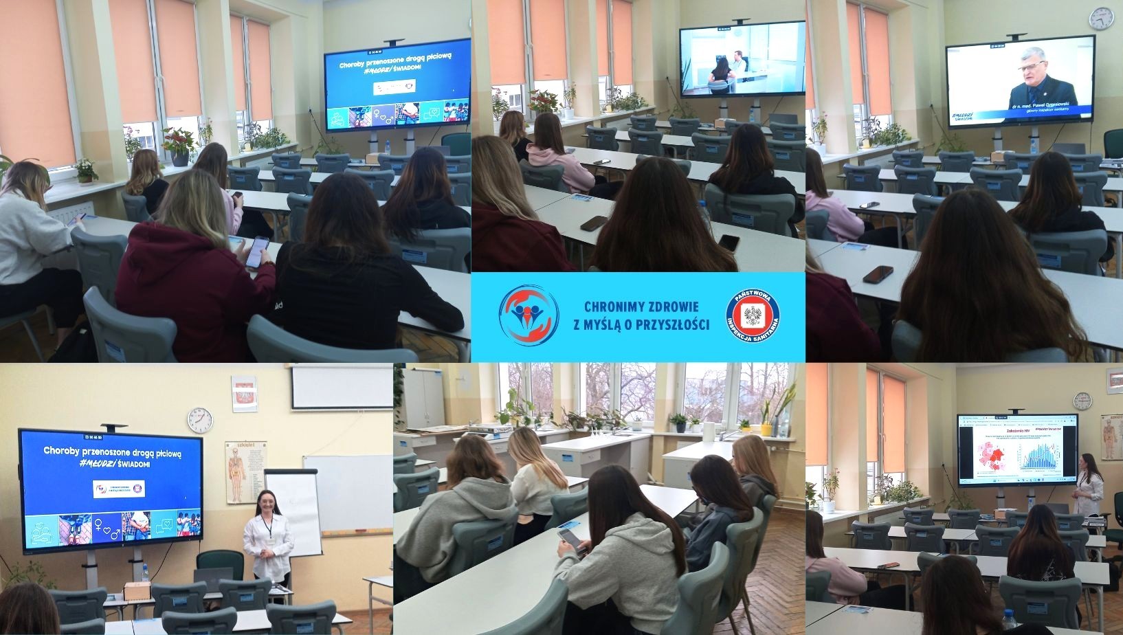 Dnia 16.03.2026 r. w Zespole Szkół w Żychlinie odbyło się spotkanie zrealizowane w ramach programu edukacyjnego #MłodziŚwiadomi. Przedstawicielka PSSE w Kutnie - Oświata Zdrowotna i Promocja Zdrowia omówiła m.in. choroby tj.: kiła, rzeżączka, chlamydioza, wszawica łonowa, świerzb, a także choroby przenoszone drogą płciową wywoływane przez wirusy: opryszczka, kłykciny kończyste, brodawki, wirusowe zapalenia wątroby, zakażenie HPV oraz zakażenie HIV i zespół nabytego niedoboru odporności (AIDS).