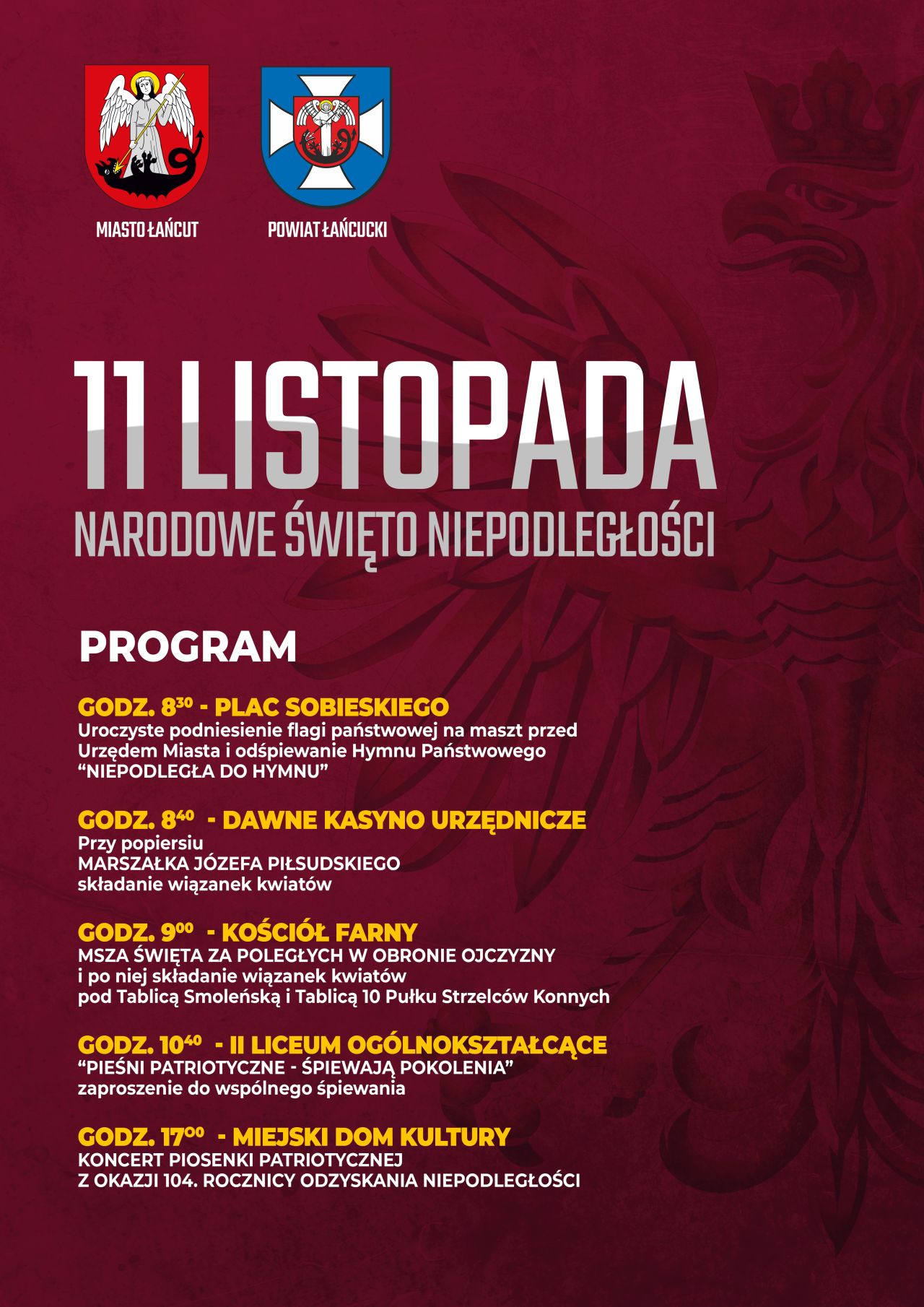 Państwowy Powiatowy Inspektor Sanitarny w Łańcucie w imieniu Burmistrza Miasta Łańcuta oraz Starosty Łańcuckiego zaprasza na UROCZYSTE OBCHODY NARODOWEGO ŚWIĘTA NIEPODLEGŁOŚCI 11 listopada 2022 r. (piątek).