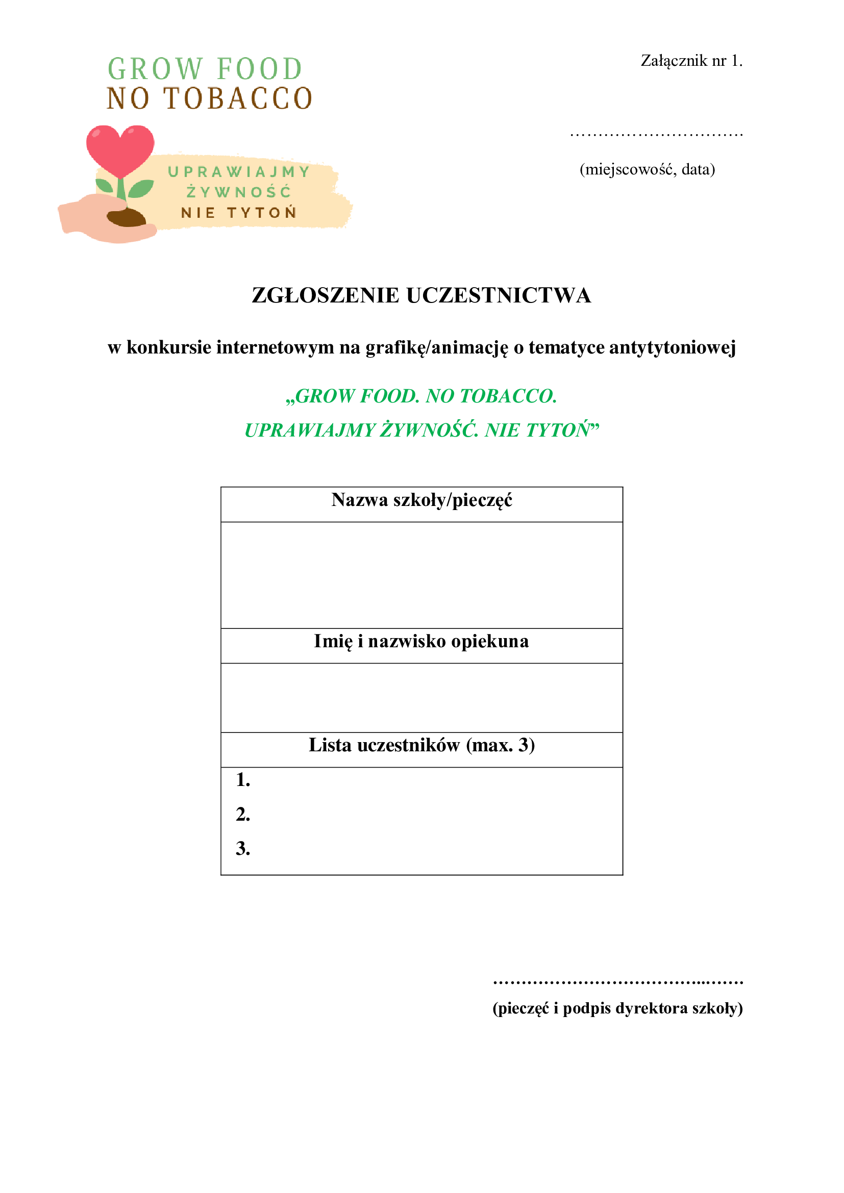 Uczestnicy przygotowują grafikę/animację tematyczną własnego autorstwa, z wykorzystaniem hasła: „GROW FOOD. NO TOBACCO. UPRAWIAJMY ŻYWNOŚĆ. NIE TYTOŃ”