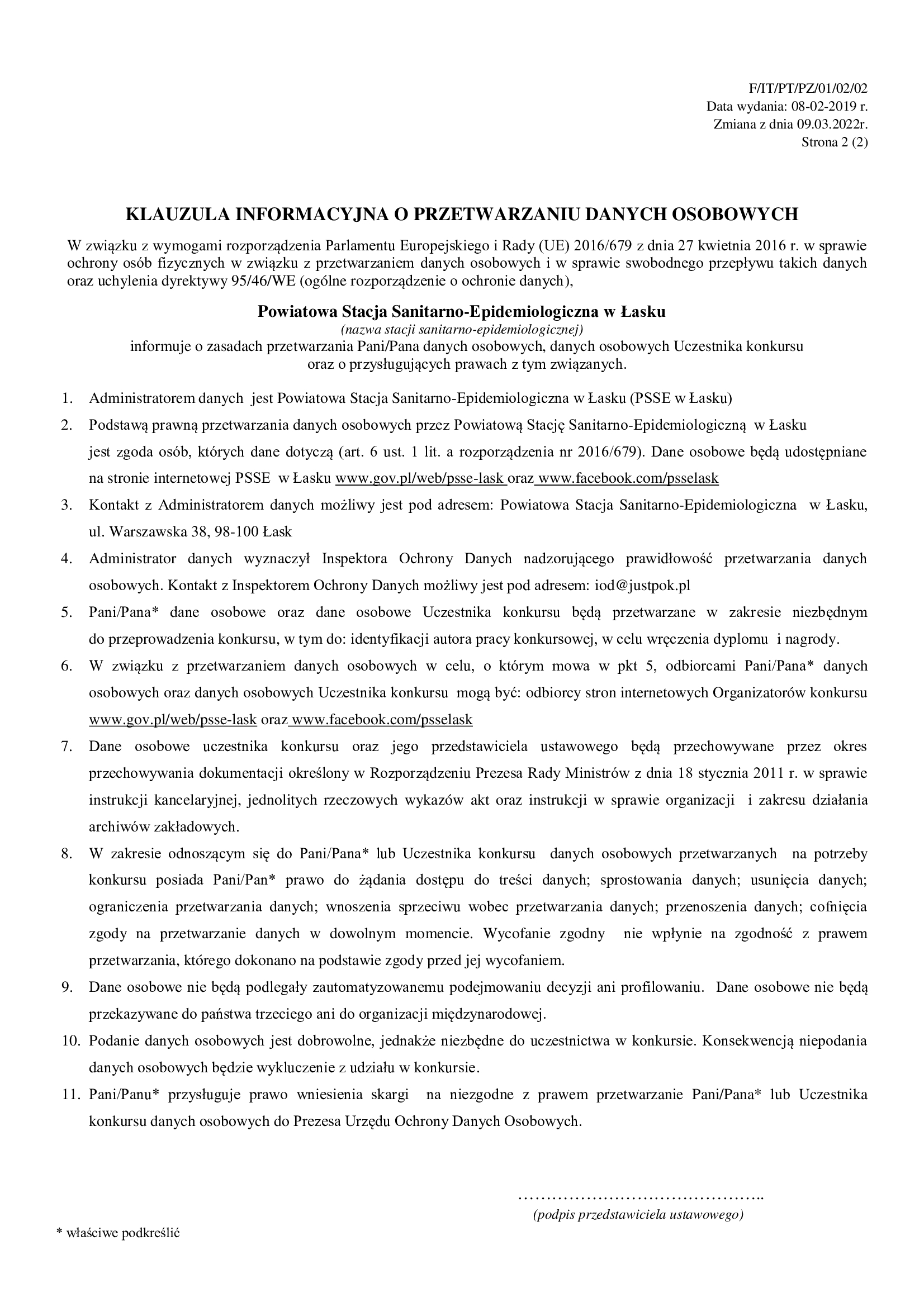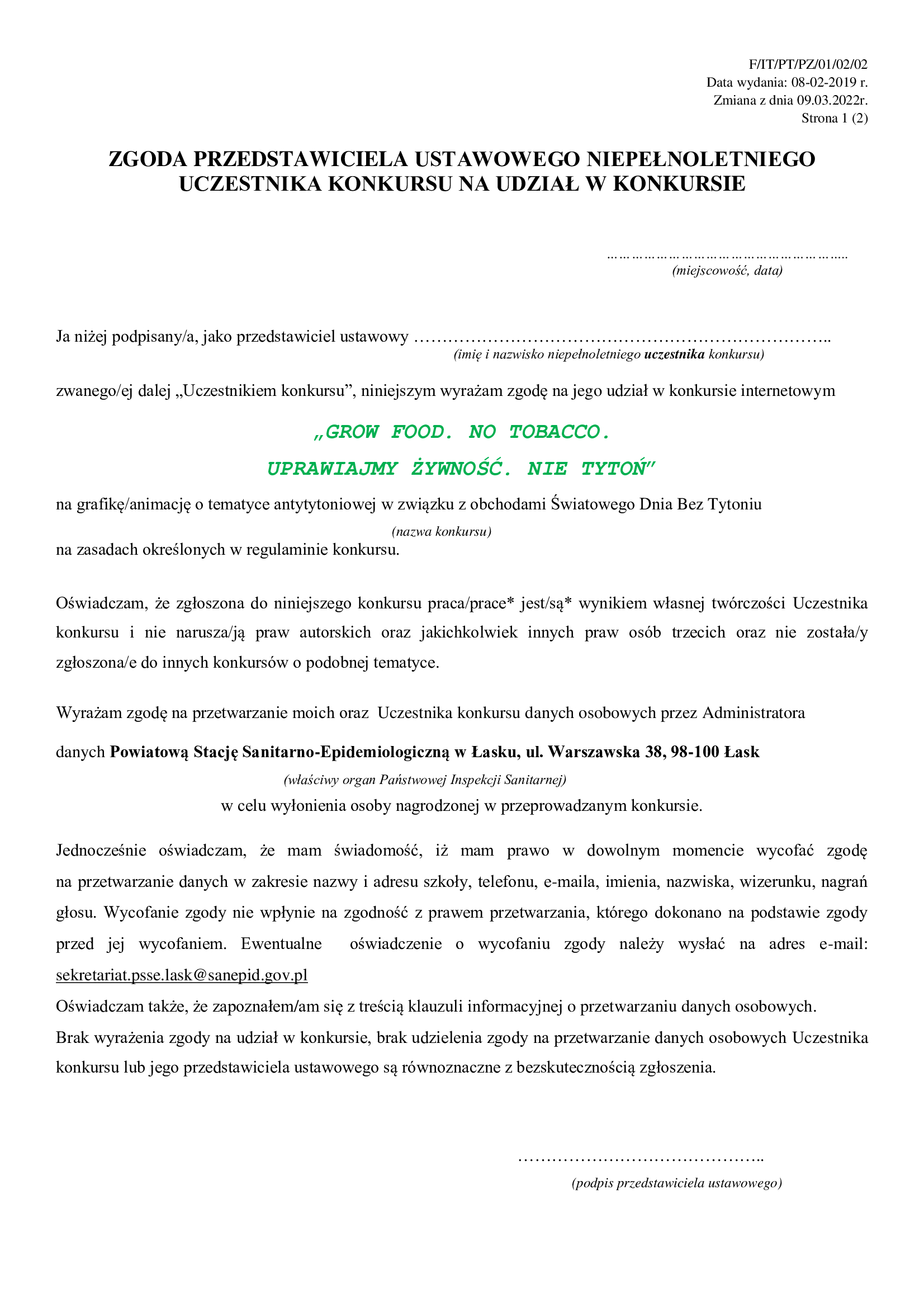 - Załącznik nr 2 - zgoda rodzica/opiekuna na udział w konkursie dziecka, które nie ukończyło 18 roku życia