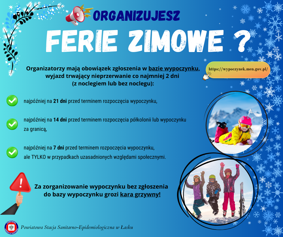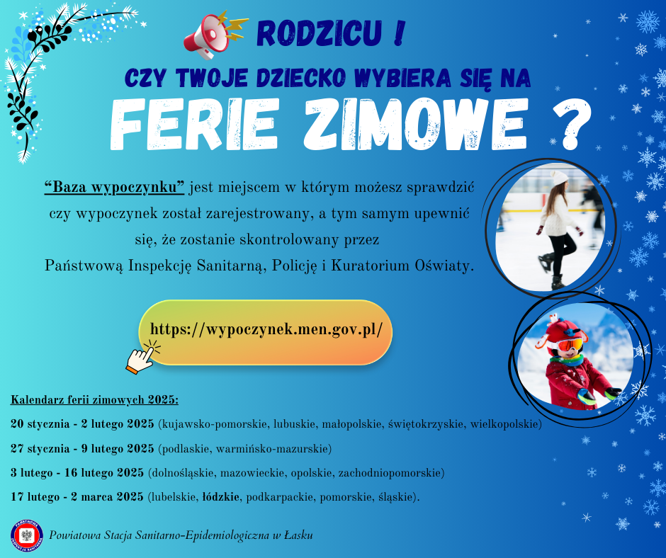 W związku ze zbliżającymi się feriami zimowymi Państwowy Powiatowy Inspektor Sanitarny w Łasku przypomina o zasadach bezpiecznego wypoczynku.