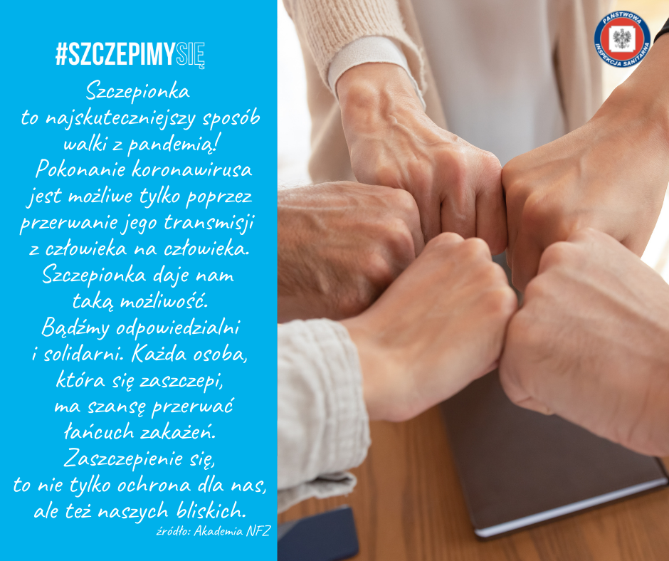 Szczepienia są najbardziej skuteczną metodą chroniącą przed zakażeniem wirusem SARS-Cov-2. Szczepiąc się troszczymy się nie tylko o samego siebie, ale przede wszystkim o swoich najbliższych. Z bardzo dużym prawdopodobieństwem – sięgającym nawet 95% – szczepienie chroni przed zakażeniem COVID-19, co w efekcie przyczyni się do szybszego znoszenia ograniczeń i powrotu do normalnego życia.