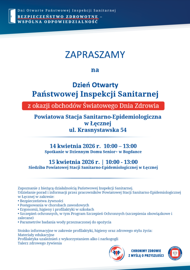 15 kwietnia 2026 r. 10:00 – 13:00 Powiatowa Stacja Sanitarno-Epidemiologiczna w Łęcznej ul. Krasnystawska 54