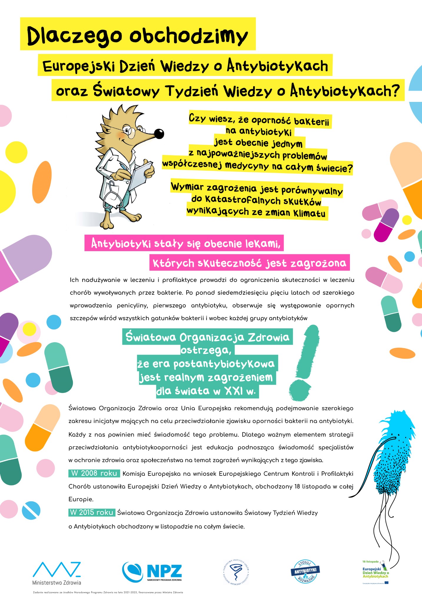 W dniu 18 listopada obchodzony jest Europejski Dzień Wiedzy o Antybiotykach oraz w dniach 18-24 listopada 2023 r. Światowy Tydzień Wiedzy o Antybiotykach. Europejski Dzień Wiedzy o Antybiotykach został ustanowiony przez Komisję Europejską na wniosek Europejskiego Centrum Zapobiegania i Kontroli Chorób. Inicjatywa ta powstała ze względu na obserwowanie niezwykle niepokojącego zjawiska bardzo szybkiego narastania oporności drobnoustrojów na antybiotyki.