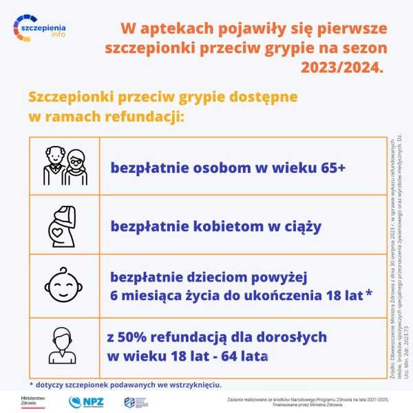 Bezpłatne szczepienia p/ grypie w sezonie 2023/2024 dostępne są dla: