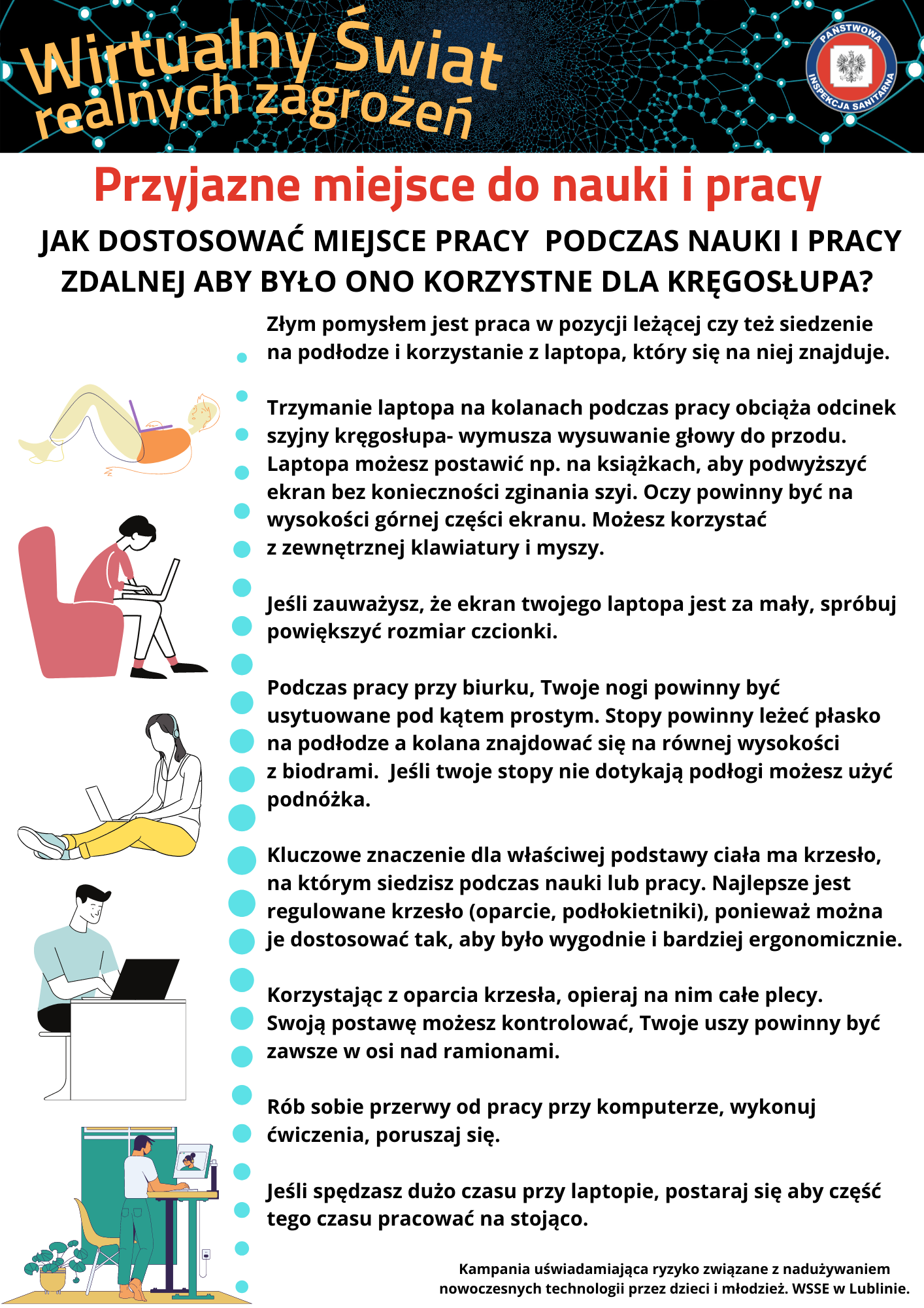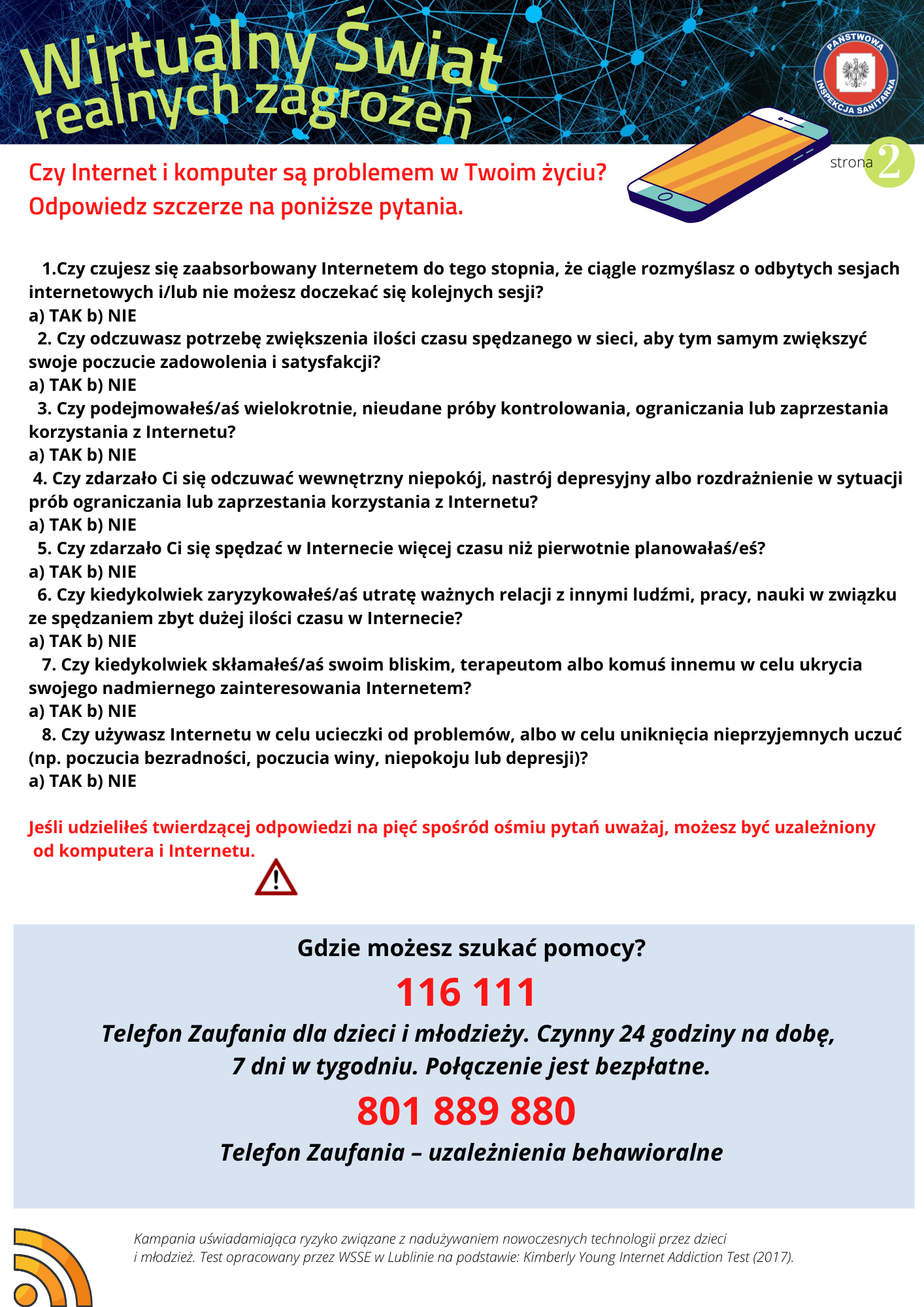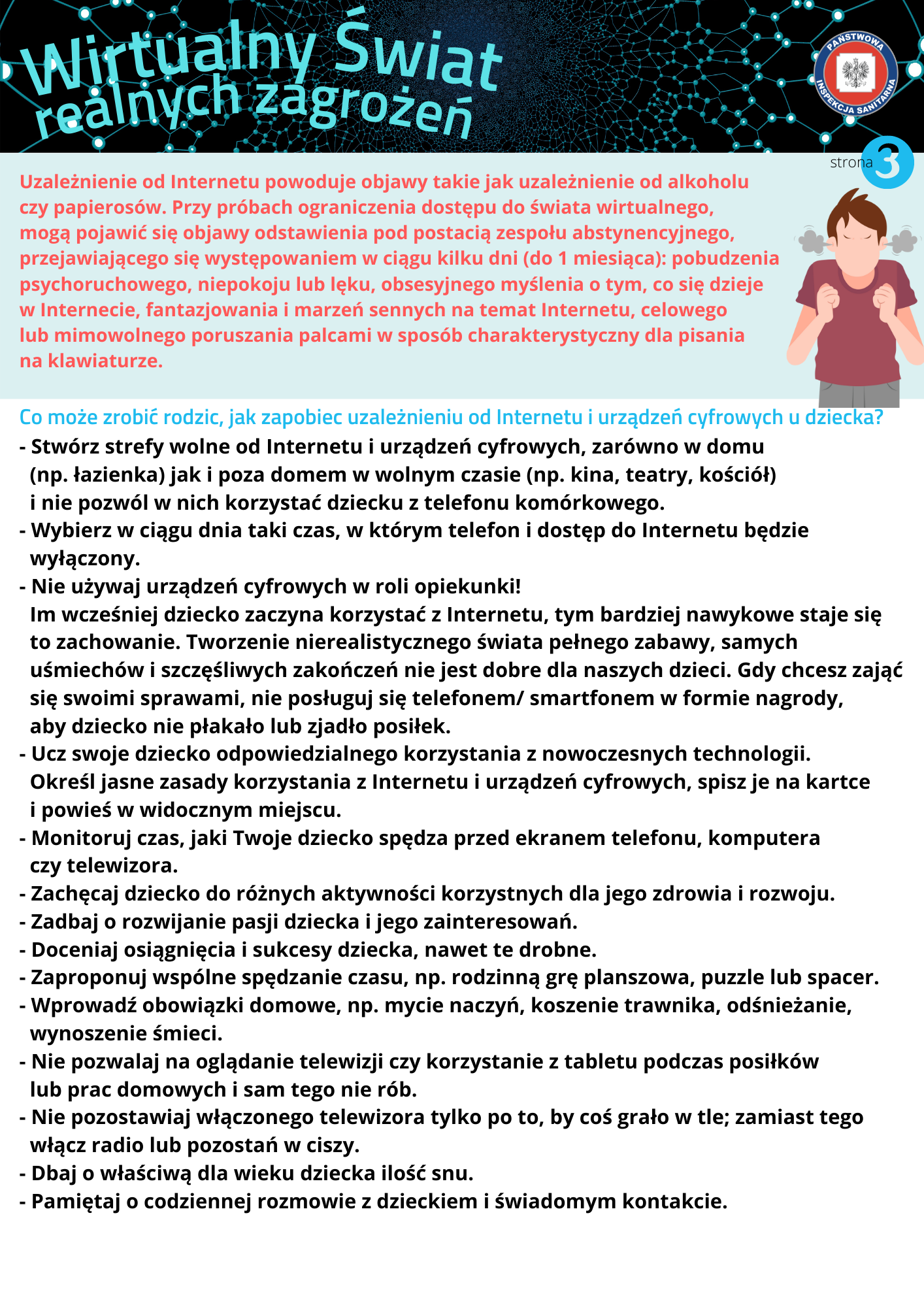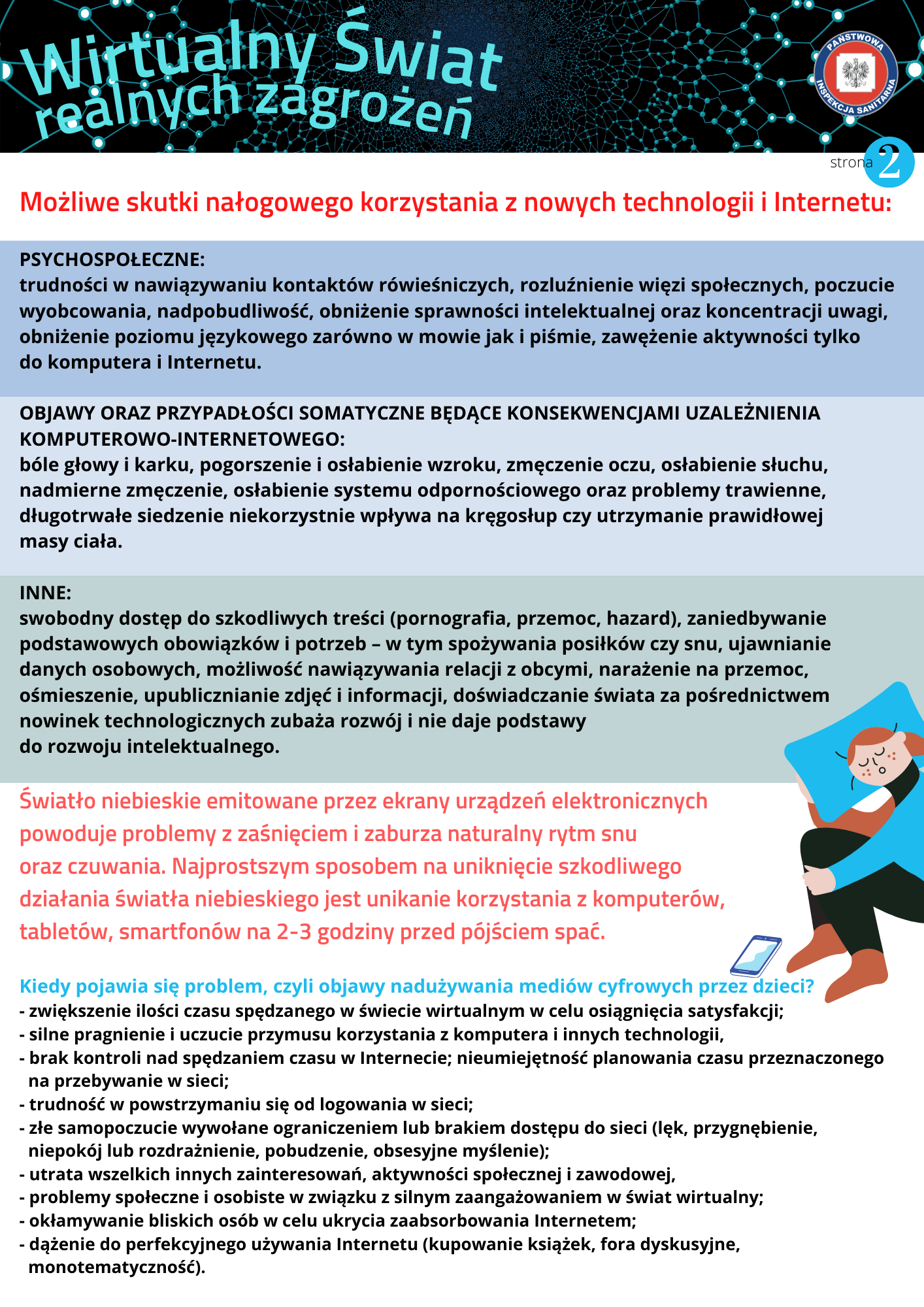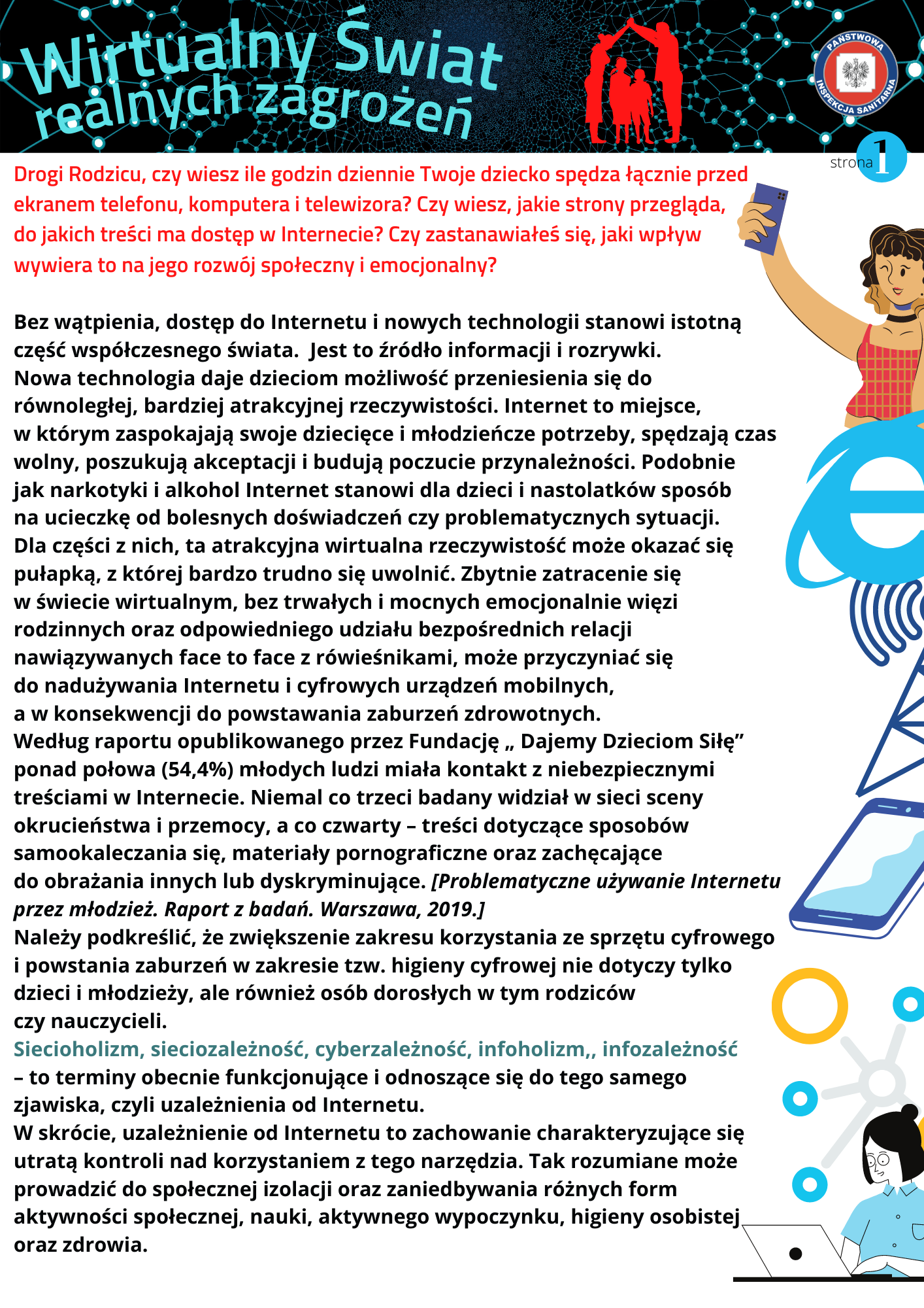 Dostęp do Internetu i nowych technologii stanowi istotną część współczesnego świata. Jest to źródło informacji i rozrywki. Nowa technologia daje dzieciom możliwość przeniesienia się do równoległej, bardziej atrakcyjnej rzeczywistości. Internet to miejsce, w którym zaspokajają swoje dziecięce i młodzieńcze potrzeby, spędzają czas wolny, poszukują akceptacji i budują poczucie przynależności. Podobnie jak narkotyki i alkohol Internet stanowi dla dzieci i nastolatków sposób na ucieczkę od bolesnych doświadczeń czy problematycznych sytuacji. Dla części z nich, ta atrakcyjna wirtualna rzeczywistość może okazać się pułapką, z której bardzo trudno się uwolnić. Zbytnie zatracenie się w świecie wirtualnym, bez trwałych i mocnych emocjonalnie więzi rodzinnych oraz odpowiedniego udziału bezpośrednich relacji nawiązywanych face to face z rówieśnikami, może przyczyniać się do nadużywania Internetu i cyfrowych urządzeń mobilnych, a w konsekwencji do powstawania zaburzeń zdrowotnych. Według raportu opublikowanego przez Fundację „ Dajemy Dzieciom Siłę” ponad połowa (54,4%) młodych ludzi miała kontakt z niebezpiecznymi treściami w Internecie. Niemal co trzeci badany widział w sieci sceny okrucieństwa i przemocy, a co czwarty – treści dotyczące sposobów samookaleczania się, materiały pornograficzne oraz zachęcające do obrażania innych lub dyskryminujące.