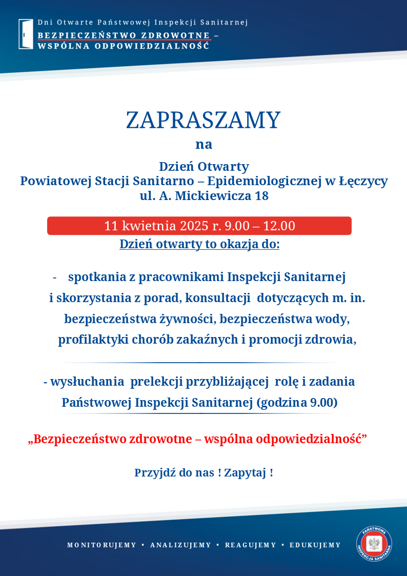 Państwowy Powiatowy Inspektor Sanitarny w Łęczycy zaprasza mieszkańców powiatu łęczyckiego na Dzień Otwarty Państwowej Inspekcji Sanitarnej organizowany przez Powiatową Stację Sanitarno-Epidemiologiczną w Łęczycy. Jest to doskonała okazja, aby poznać bliżej naszą działalność, zadania oraz znaczenie inspekcji sanitarnej w zapewnianiu zdrowia i bezpieczeństwa publicznego.