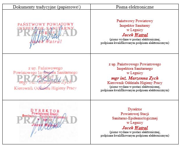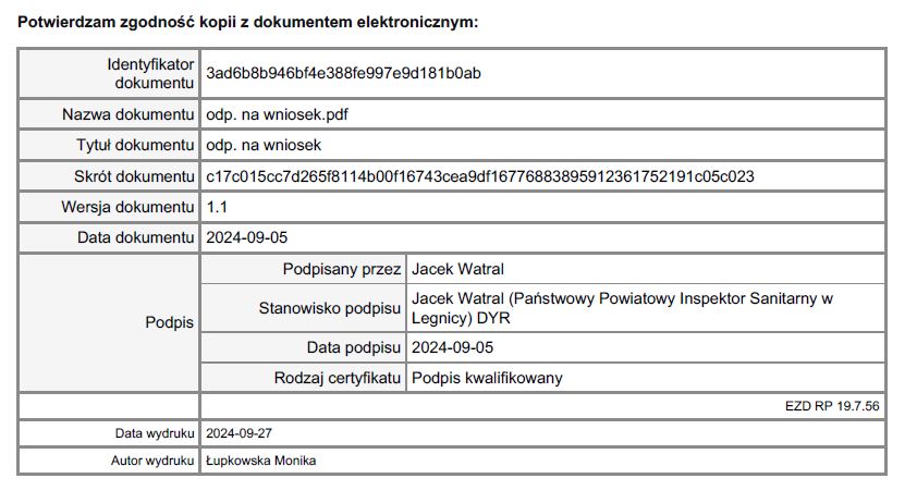 W związku z powyższym Państwowy Powiatowy Inspektor Sanitarny w Legnicy podpisuje pisma przy użyciu kwalifikowanego podpisu elektronicznego.