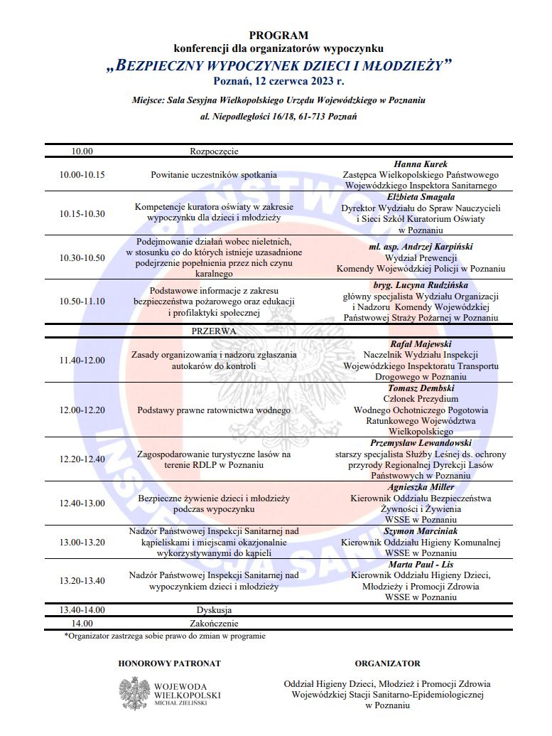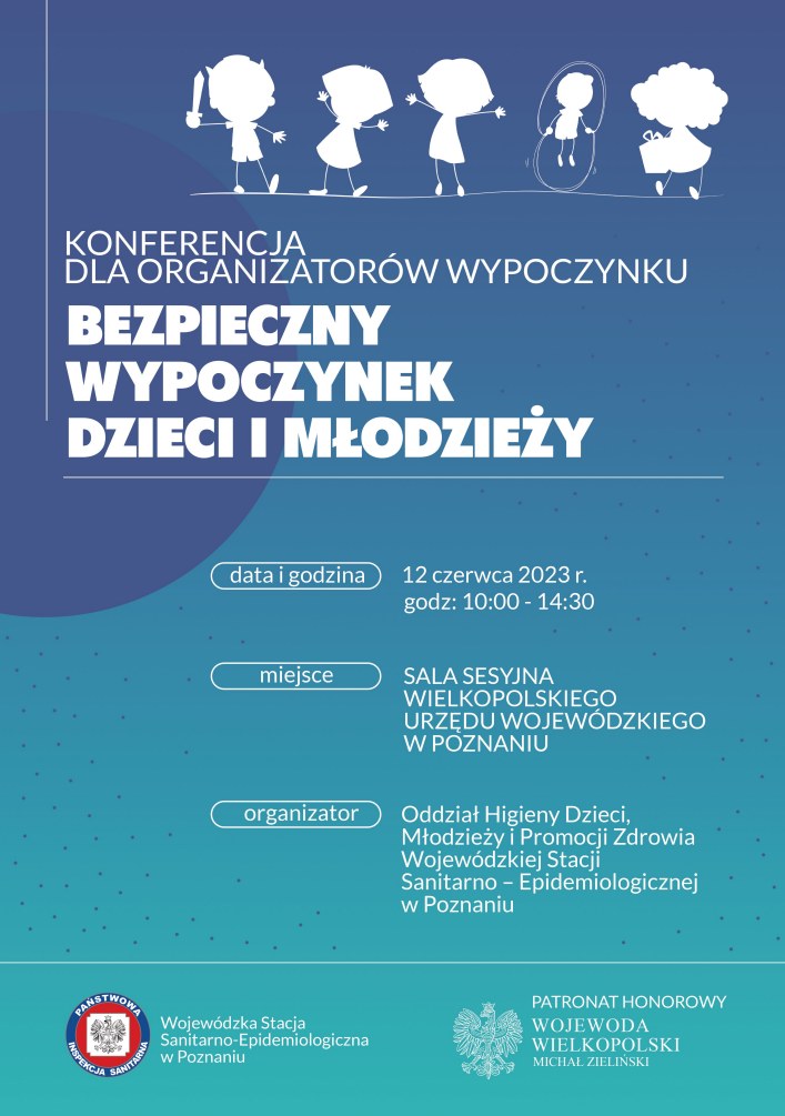 Państwowy Powiatowy Inspektor Sanitarny w Lesznie informuje, że w związku ze zbliżającym się sezonem letniego wypoczynku dzieci i młodzieży, Wielkopolski Państwowy Wojewódzki Inspektor Sanitarny w dniu 12 czerwca 2023 r. w Sali Sesyjnej Wielkopolskiego Urzędu Wojewódzkiego w Poznaniu, al. Niepodległości 16/18 organizuje konferencję, podczas której przedstawiciele Wojewódzkiej Stacji Sanitarno-Epidemiologicznej w Poznaniu, Kuratorium Oświaty w Poznaniu, Komendy Wojewódzkiej Policji w Poznaniu, Komendy Wojewódzkiej Państwowej Straży Pożarnej w Poznaniu, Wojewódzkiego Inspektoratu Transportu Drogowego w Poznaniu, Wodnego Ochotniczego Pogotowia Ratunkowego, a także Regionalnej Dyrekcji Lasów Państwowych w Poznaniu przedstawią najistotniejsze zagadnienia dotyczące zgłoszenia wypoczynku oraz zasad jego organizowania i nadzorowania.
