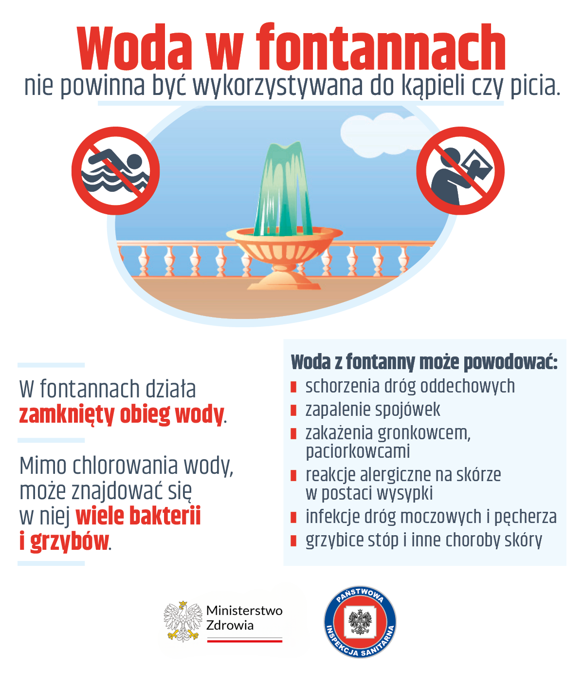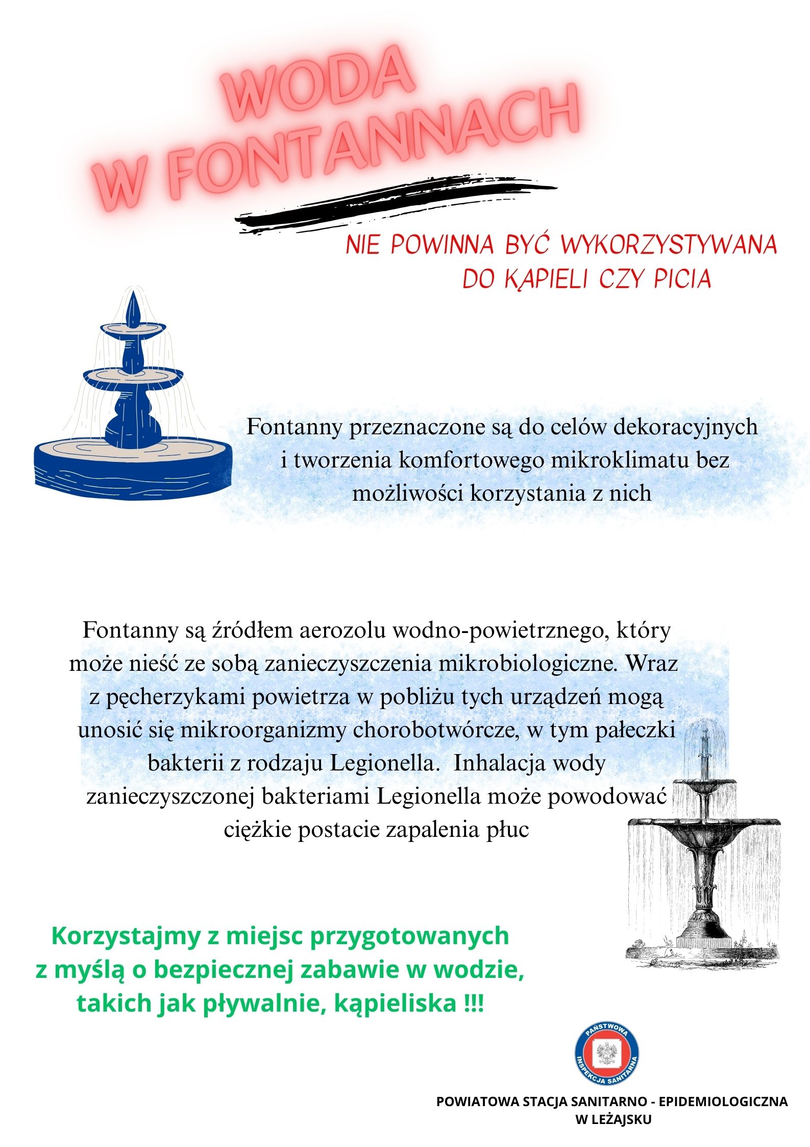 Państwowy Powiatowy Inspektor Sanitarny w Leżajsku, w związku z rozpoczynjącym się sezonem wakacyjnym, informuje o potencjalnych zagrożeniach dla zdrowia ludzi w związku z funkcjonowaniem fontann. Szczególną uwagę należy zwrócić na urządzenia i atrakcje wytwarzające aerozol wodny, gdyż z ich funkcjonowaniem wiąże się ryzyko występowania i namnażania w instalacji wodnej bakterii z rodzaju Legionella.