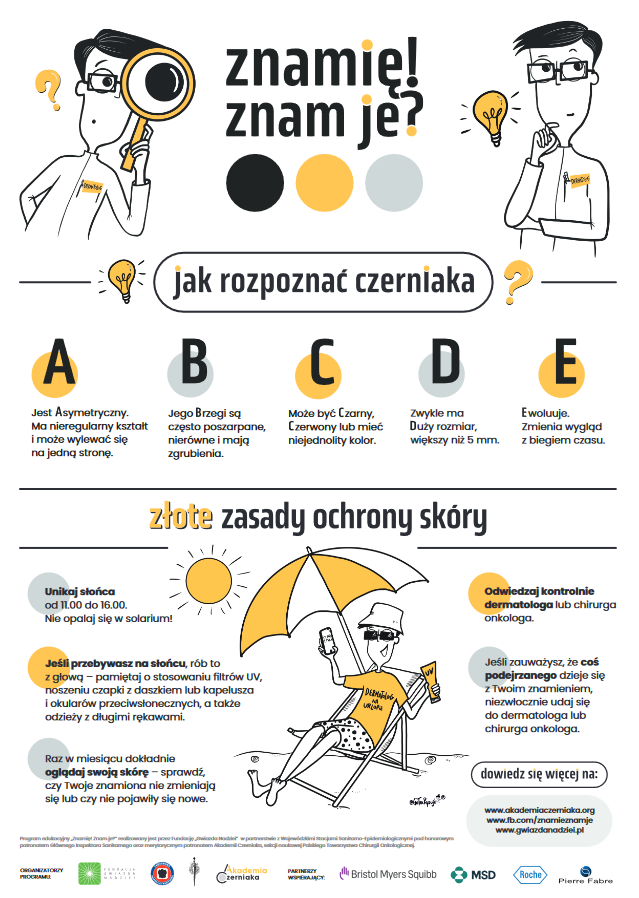 "Znamię! Znam je?" to program edukacyjny dotyczący profilaktyki czerniaka, dedykowany szkołom ponadpodstawowym i starszym klasom szkół podstawowych.