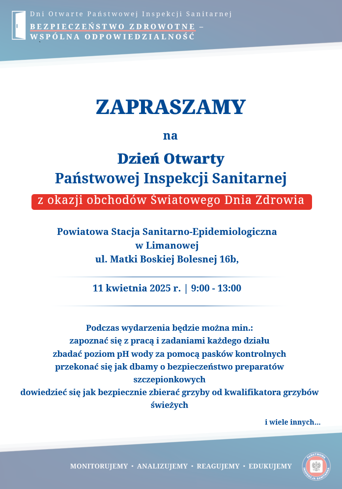 Państwowy Powiatowy Inspektor Sanitarny w Limanowej zaprasza na Dzień Otwarty Państwowej Inspekcji Sanitarnej z okazji obchodów Światowego Dnia Zdrowia, który odbędzie się 11 kwietnia 2025 r. w godzinach od godziny 9:00 do godziny 13:00.