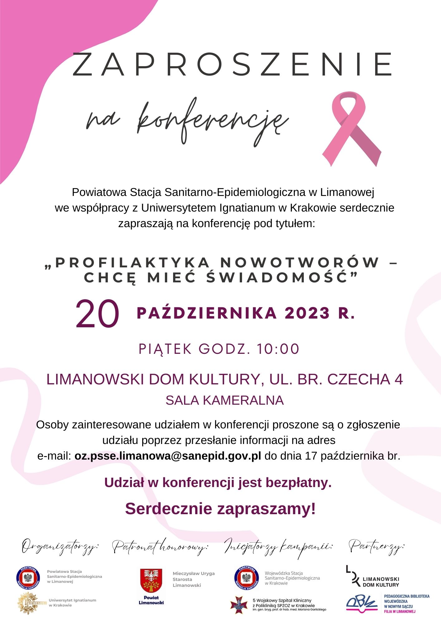 Powiatowa Stacja Sanitarno-Epidemiologiczna w Limanowej we współpracy z Uniwersytetem Ignatianum w Krakowie, pod honorowym patronatem Starosty Limanowskiego – Mieczysława Urygi organizują konferencję pod nazwą: „Profilaktyka nowotworów – chcę mieć świadomość”, na którą zapraszamy wszystkie osoby zainteresowane tematyką, w szczególności pracowników oświaty oraz pracowników służb medycznych. Konferencja odbędzie się 20 października 2023 r. w Limanowskim Domu Kultury, ul. Bronisława Czecha 4, sala kameralna.