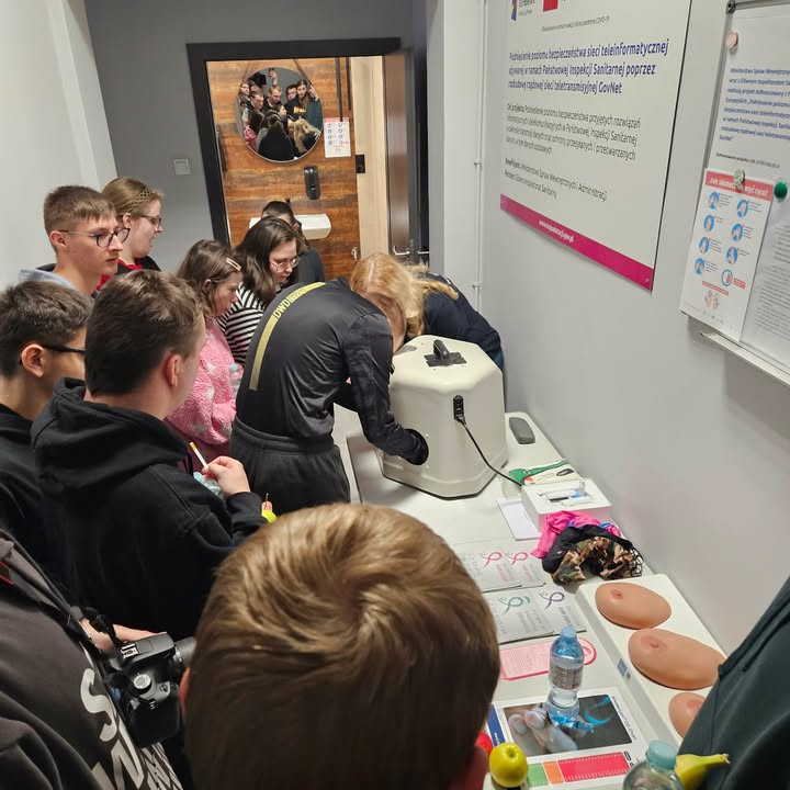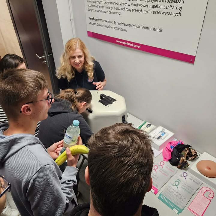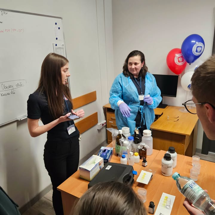 Istotnym elementem wydarzenia były zajęcia praktyczne, które cieszyły się dużym zainteresowaniem uczestników. Uczniowie wzięli udział m.in. w badaniu skuteczności higieny rąk przy użyciu lampy UV, co pozwoliło im w sposób obrazowy zrozumieć znaczenie właściwego mycia i dezynfekcji rąk. Dodatkowo zaprezentowano metody oceny jakości wody z wykorzystaniem pasków kontrolnych, co stanowiło cenne uzupełnienie wiedzy teoretycznej.