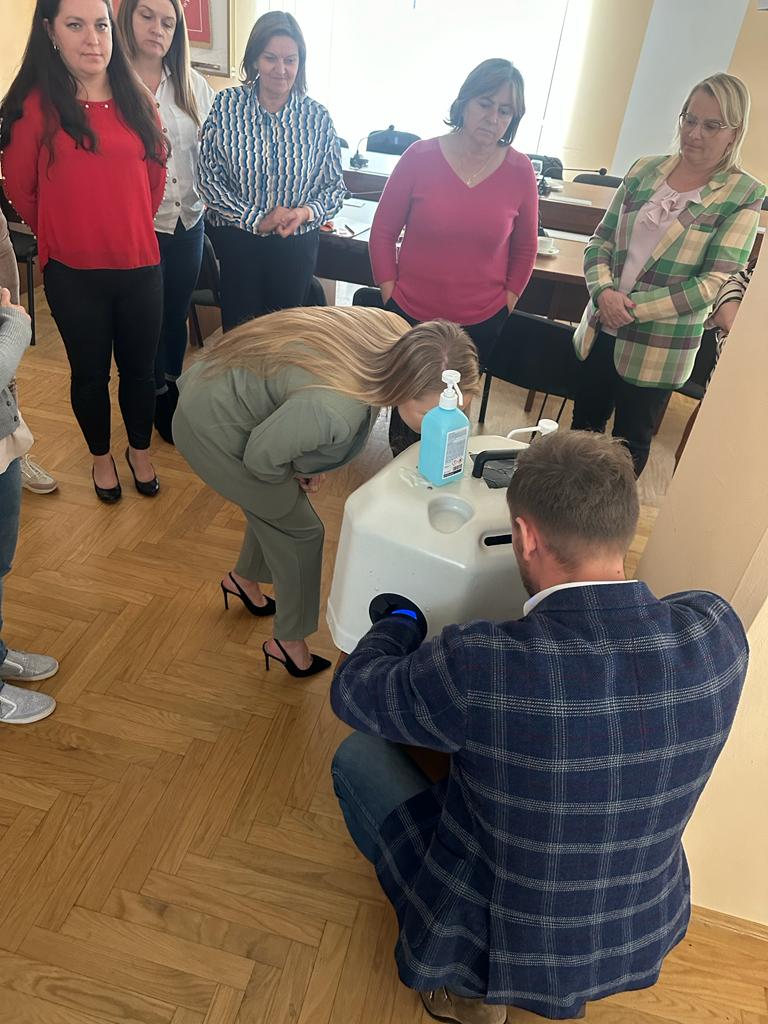 Uczestnicy mieli możliwość udziału w ćwiczeniu praktycznym z wykorzystaniem lampy UV i środka fluorescencyjnego, który bezpiecznie i skutecznie demaskuje błędy w procedurze higieny rąk. Okazało się, że dezynfekcja rąk nie jest taka prosta, zwłaszcza, gdy ręce są do niej nieprzygotowane (biżuteria, lakier do paznokci), co można było zobaczyć bezpośrednio pod lampą UV.