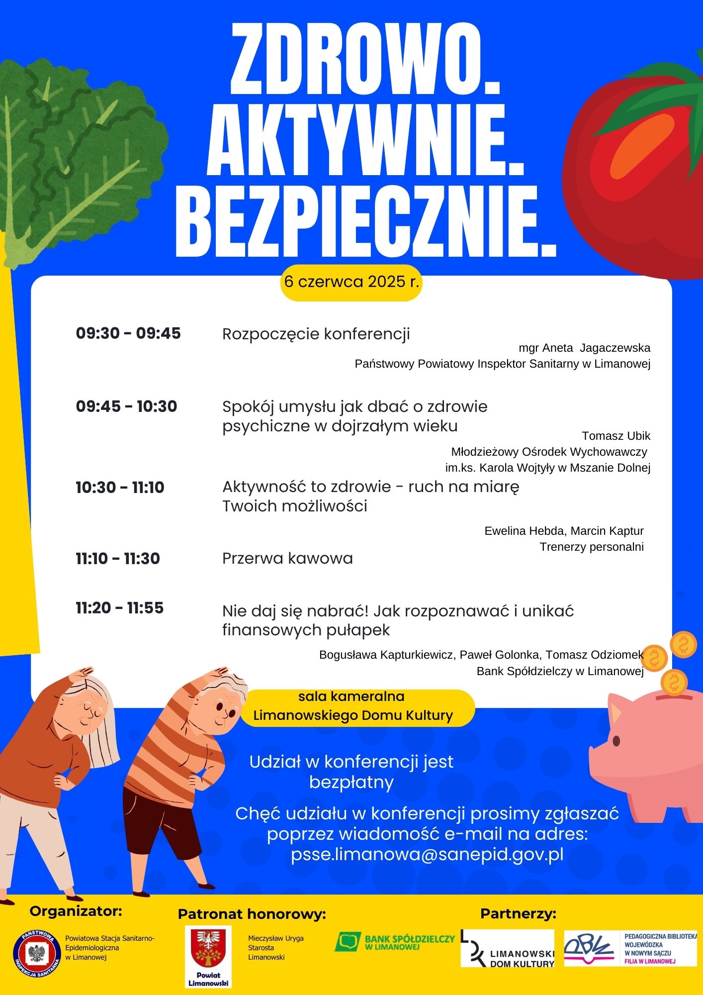Państwowy Powiatowy Inspektor Sanitarny w Limanowej serdecznie zaprasza seniorów z terenu powiatu limanowskiego do udziału w konferencji pod hasłem „Zdrowo. Aktywnie. Bezpiecznie”, która odbędzie się 6 czerwca 2025 r. w Limanowskim Domu Kultury, ul. Br. Czecha 4, 34-600 Limanowa. Wydarzenie zostało objęte patronatem honorowym Starosty Limanowskiego, co podkreśla wagę podejmowanej tematyki oraz zaangażowanie lokalnych władz w działania na rzecz poprawy jakości życia osób starszych. Konferencja ma na celu zwiększenie świadomości seniorów w zakresie profilaktyki zdrowotnej, aktywności fizycznej oraz szeroko pojętego bezpieczeństwa – zarówno psychicznego, jak i finansowego. Uczestnicy będą mieli okazję wysłuchać prelekcji specjalistów z różnych dziedzin, którzy w przystępny sposób przedstawią: