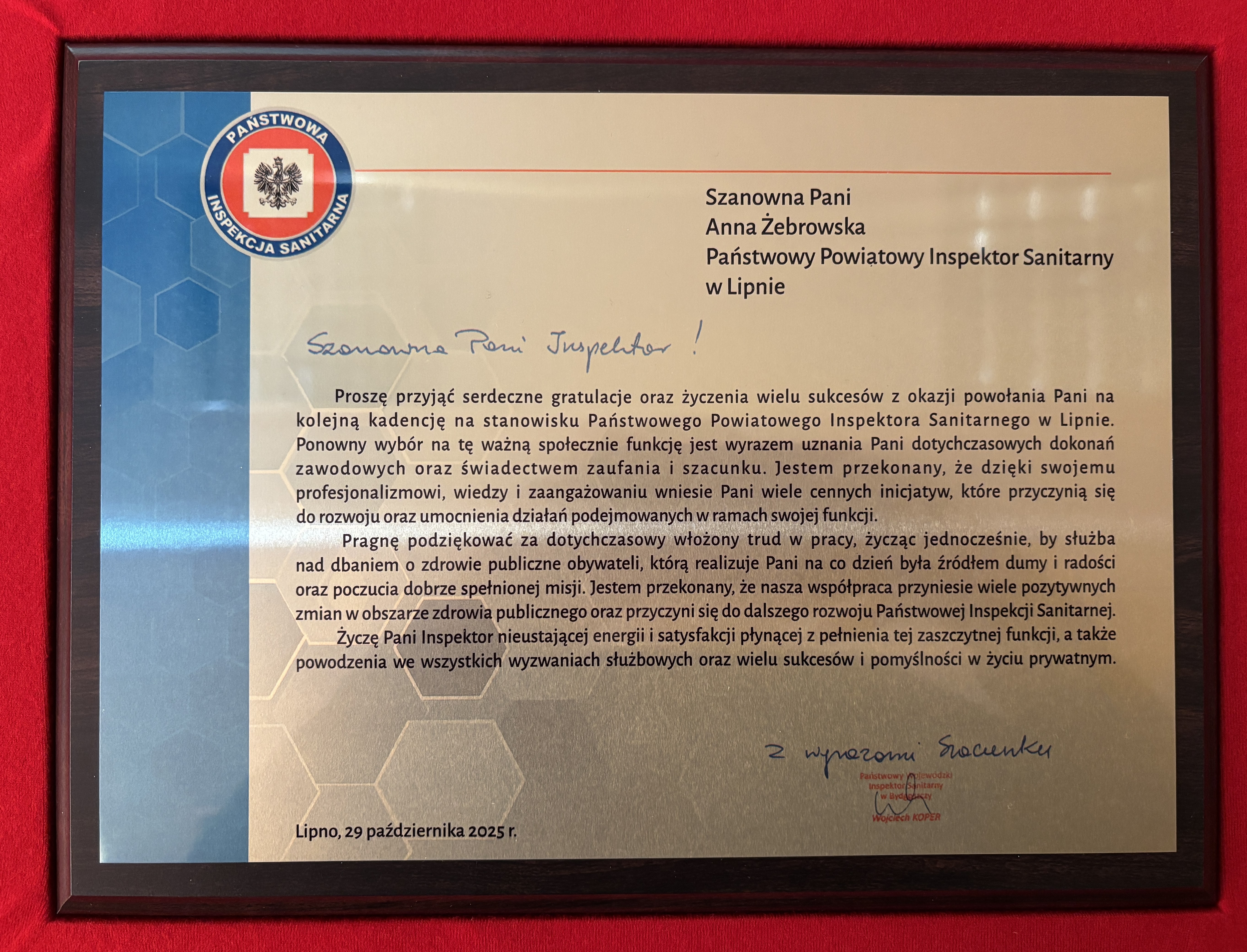 Państwowy Wojewódzki Inspektor Sanitarny w Bydgoszczy Wojciech Koper uroczyście wręczył akt powołania w obecności Starosty Lipnowskiego Krzysztofa Baranowskiego oraz przedstawicieli samorządu lokalnego. Uroczystość odbyła się w siedzibie Starostwa Powiatowego w Lipnie.
