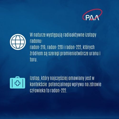 Spośród izotopów radonu największe znaczenie w środowisku ma radon-222. W wyniku promieniotwórczego rozpadu radonu-222 emitowane jest promieniowanie alfa i powstają niebezpieczne dla organizmu człowieka produkty rozpadu radonu – metale ciężkie takie jak polon, bizmut i ołów.