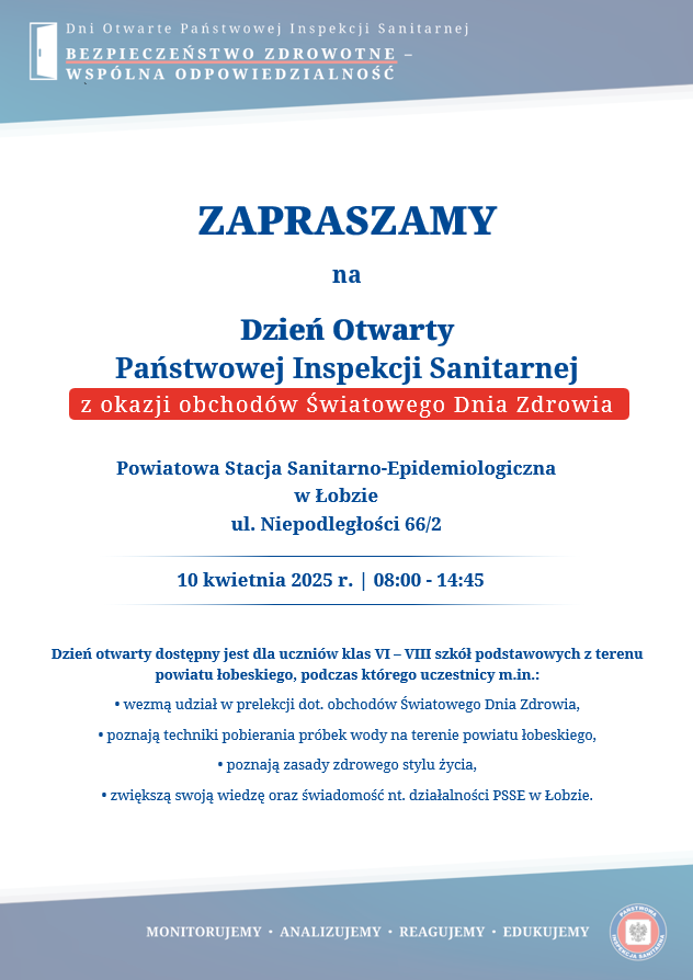 Państwowy Powiatowy Inspektor Sanitarny w Łobzie uprzejmie informuje, iż w ramach obchodów Światowego Dnia Zdrowia, który przypada 7 kwietnia 2025 r. ogłasza się dzień otwarty dla uczniów klas VI – VIII szkół podstawowych w siedzibie Powiatowej Stacji Sanitarno – Epidemiologicznej w Łobzie.