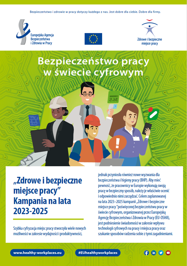 Cyfryzacja wpływa na nasze codzienne życie, społeczeństwo i pracę. Stwarza nowe możliwości dla pracodawców i pracowników, ale jest również źródłem ryzyka w zakresie bezpieczeństwa i zdrowia. Kampania „Zdrowe i bezpieczne miejsce pracy. Bezpieczeństwo pracy w świecie cyfrowym” na lata 2023-2025 ma na celu podniesienie wiedzy na temat znaczenia obszaru bezpieczeństwa i zdrowia w pracy w erze cyfrowej oraz wdrożenie takiego podejścia do cyfryzacji w miejscu pracy, które będzie skupione na potrzebach człowieka.