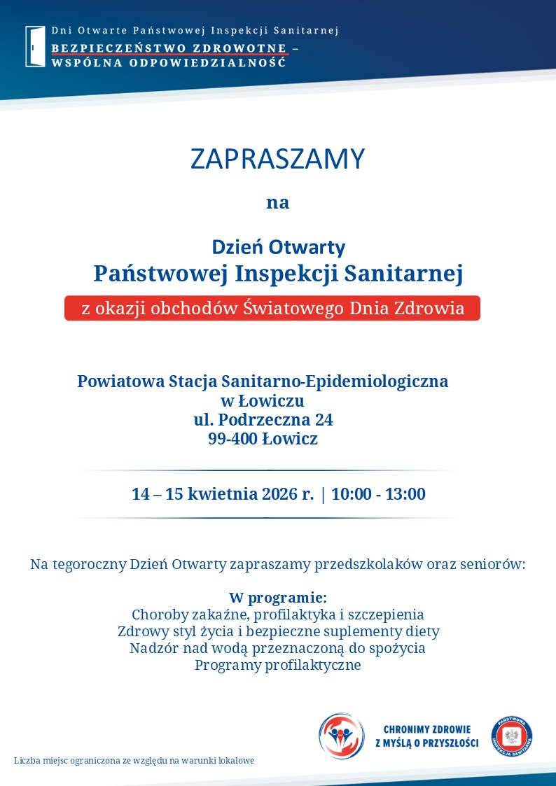 Z okazji Światowego Dnia Zdrowia pod hasłem „Razem dla zdrowia - wspieramy naukę” serdecznie zapraszamy przedszkolaków oraz seniorów na Dzień Otwarty w Powiatowej Stacji Sanitarno-Epidemiologicznej w Łowiczu w dniach 14-15 kwietnia 2026 roku.